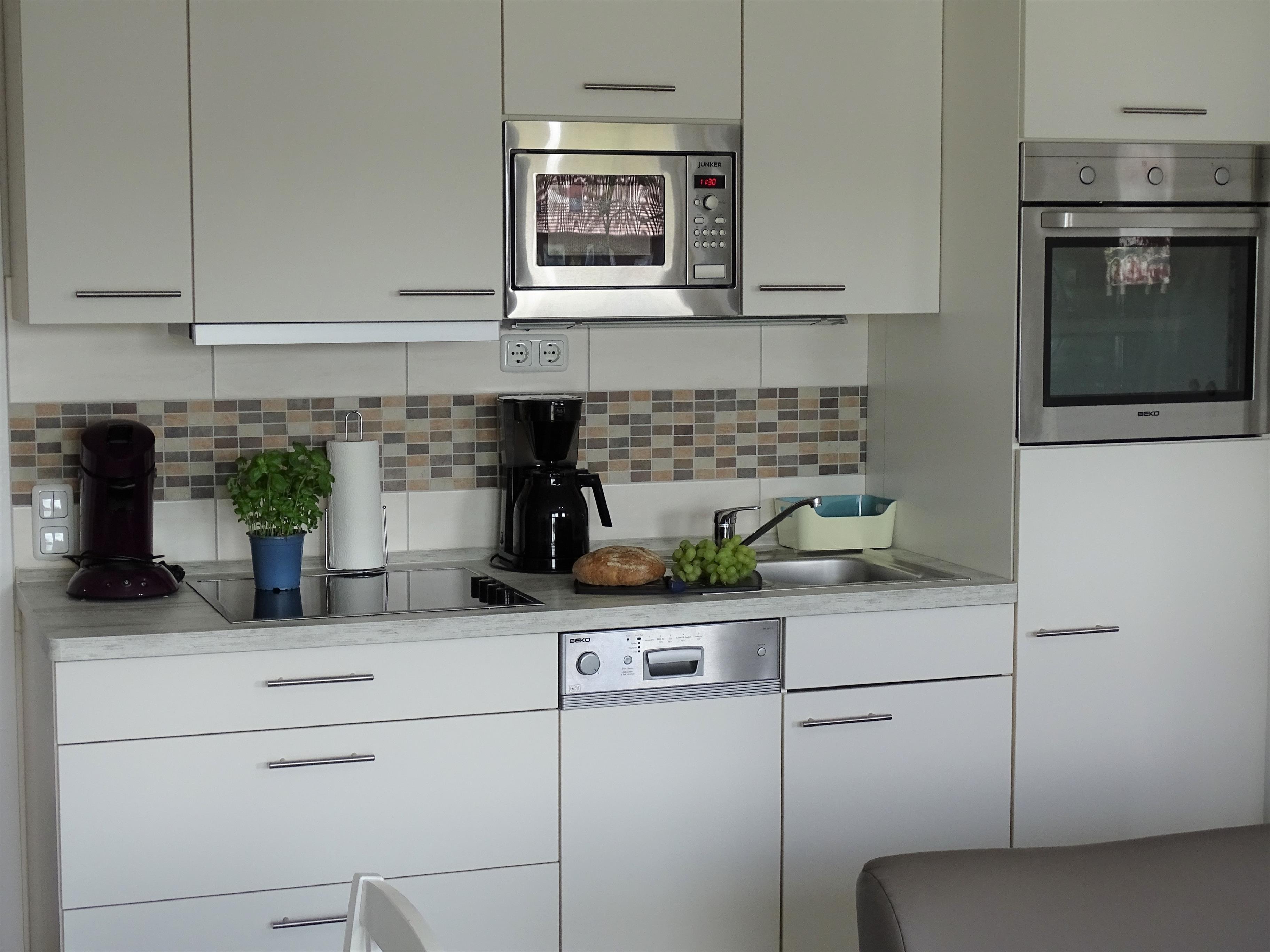 Cerankochfeld, Geschirrspüler, Backofen, Mikrowelle und einem Kühlschrank mit Gefrierfach ausgestattet.