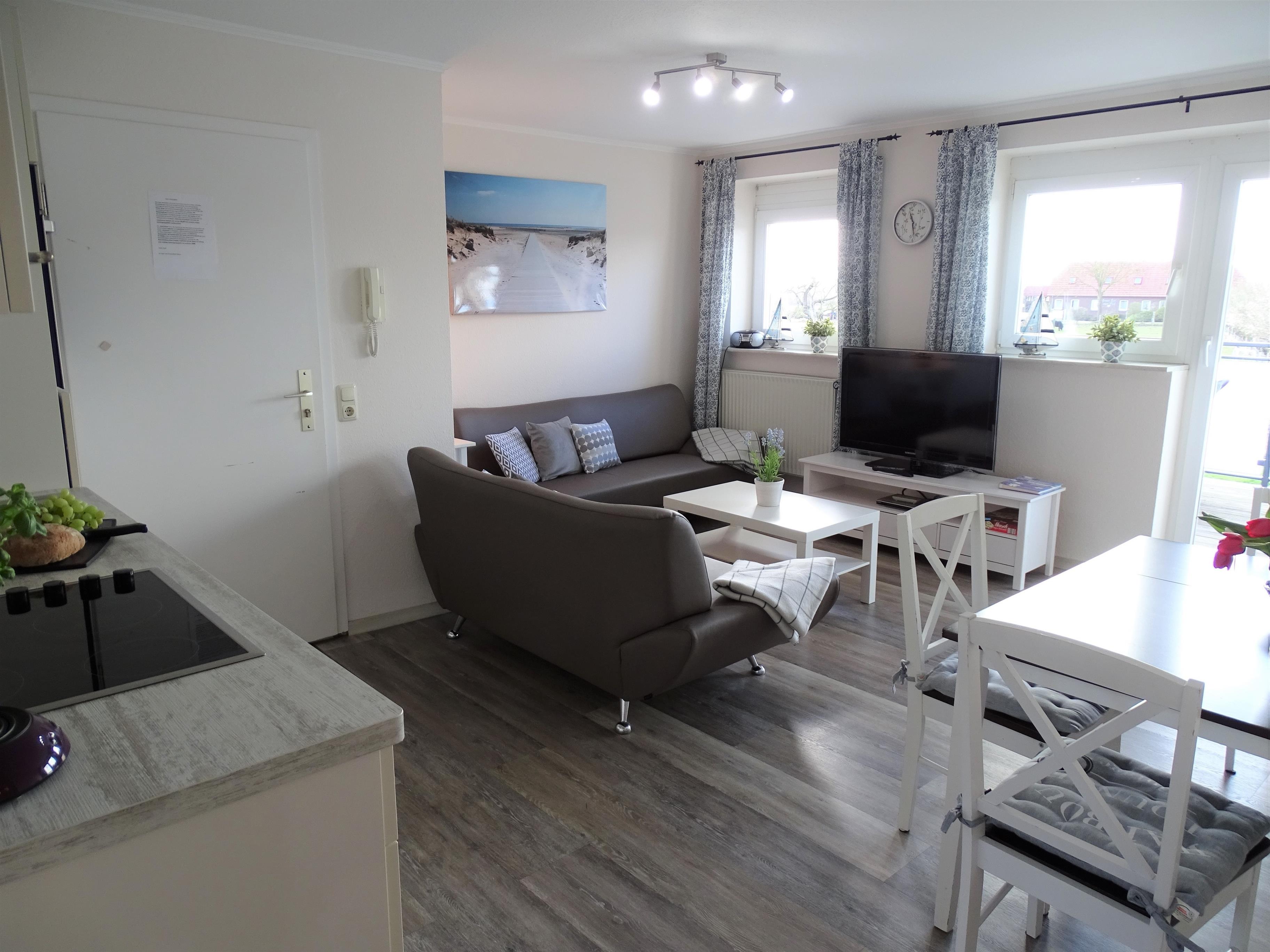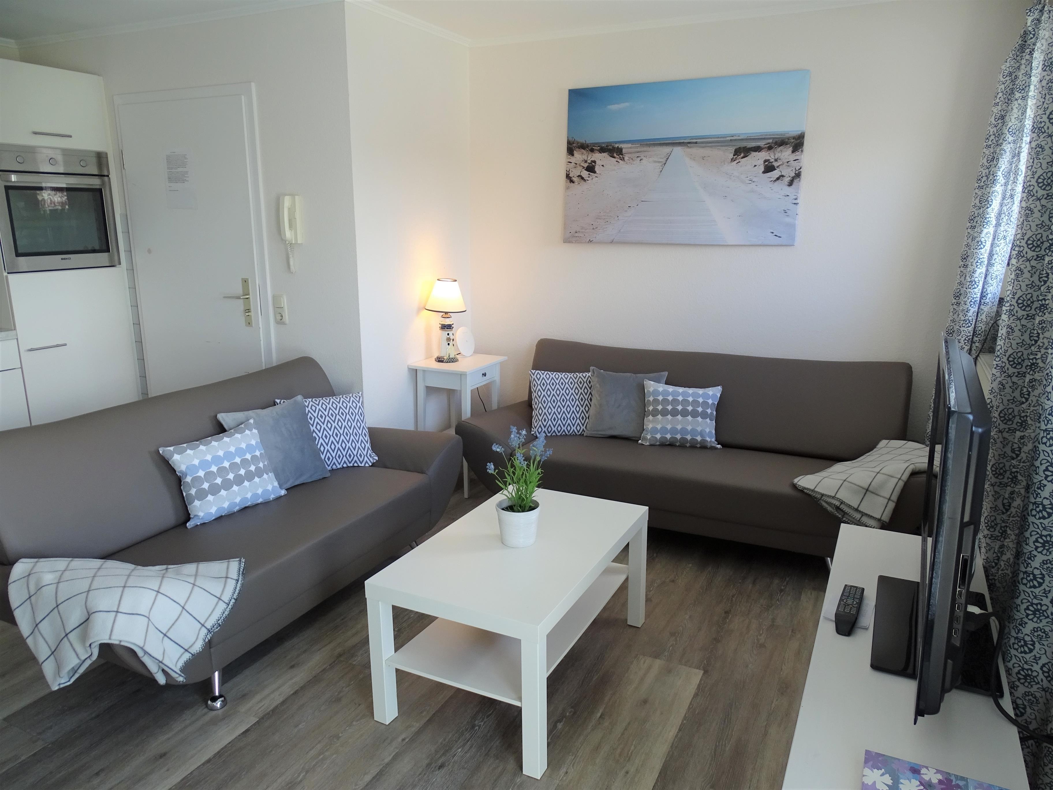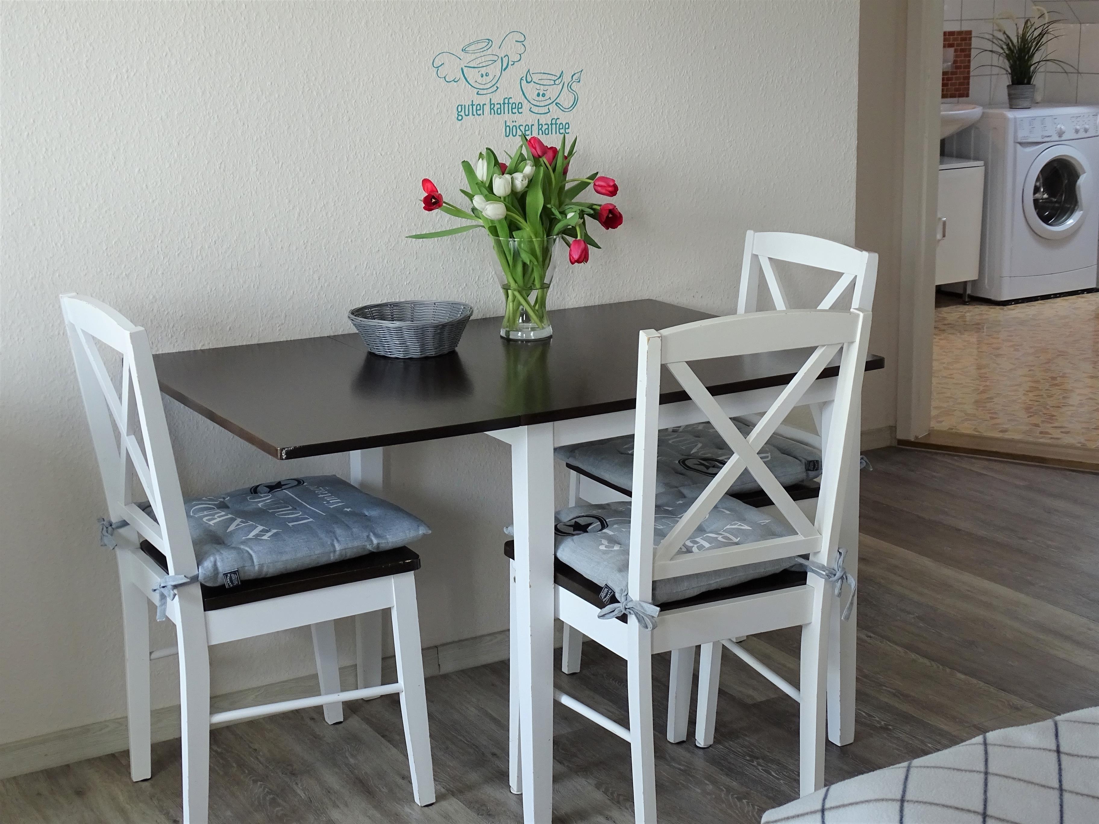 Aufgeteilt ist das moderne Ferienobjekt in Wohnzimmer mit Flachbildfernseher, DVD- Player, WLAN Internetzugang, neuer Küchenzeile, Balkonzugang, 2 Schlafzimmer, eines mit Doppelbett und eines mit 2 Einzelbetten. Hier kann sich die ganze Familie während des Ostseeurlaubes erholen. Der Essbereich befindet sich im Wohnzimmer, dort können Sie am Esstisch 80x80cm mit 4 Stühlen Ihre Speisen zu sich nehmen.