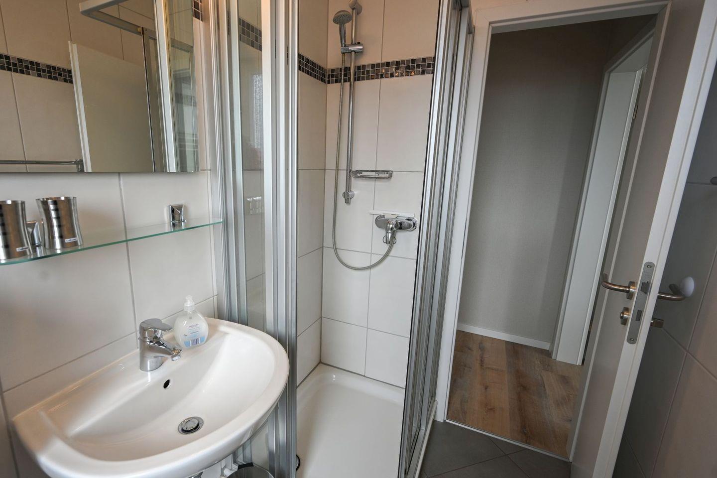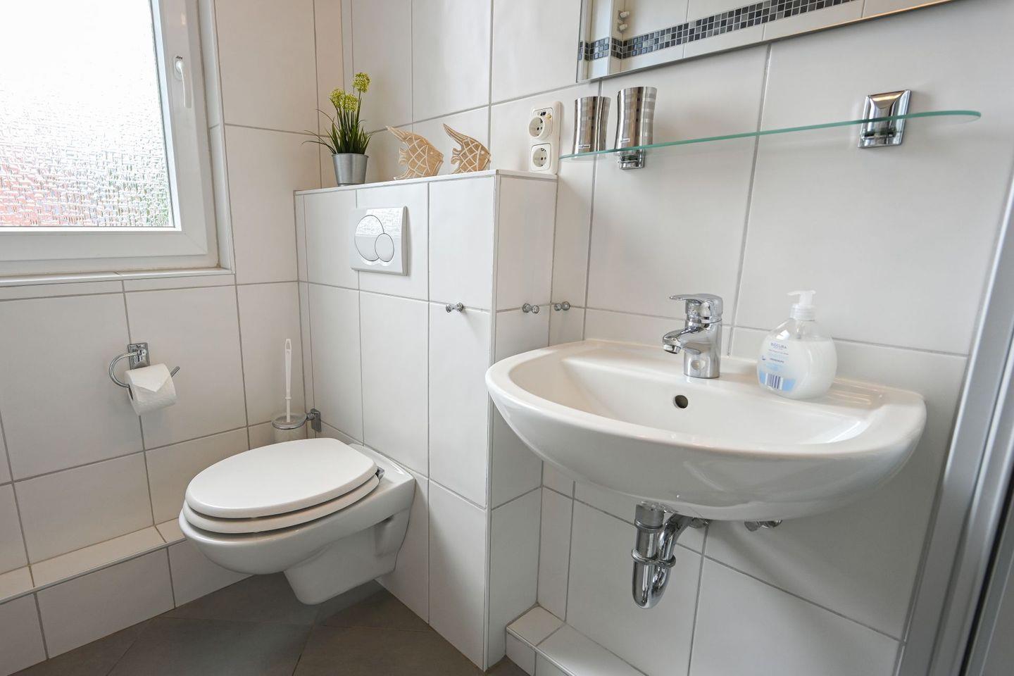 - tageslichthelles Badezimmer mit Dusche, WC und Handtuchheizkörper