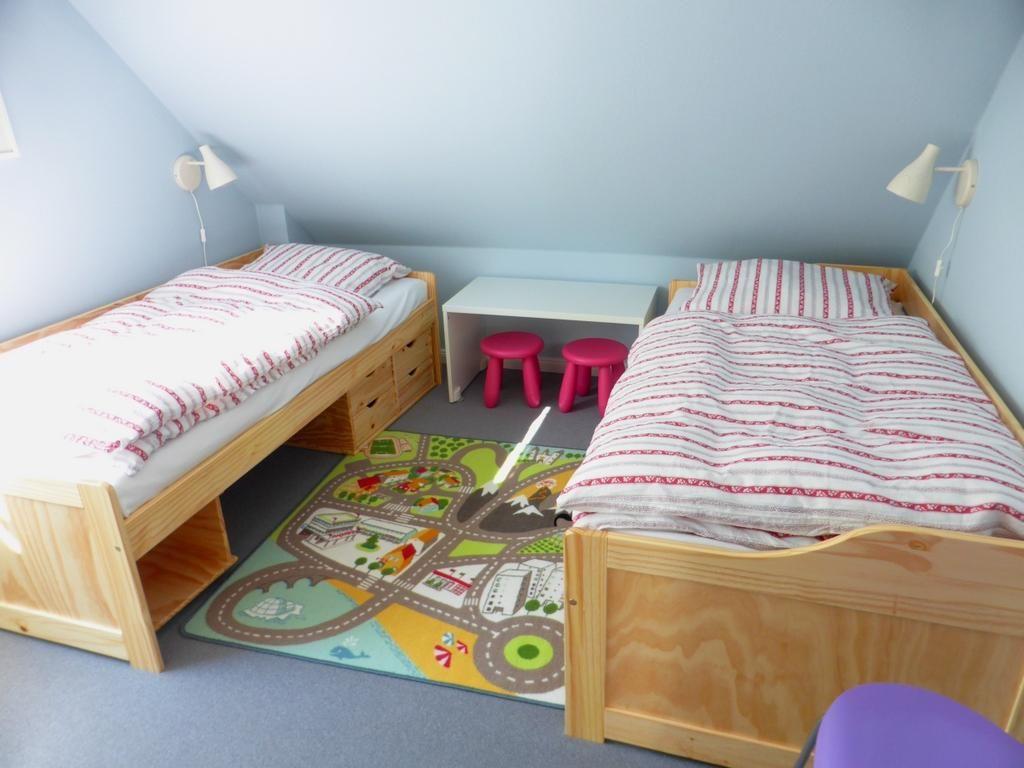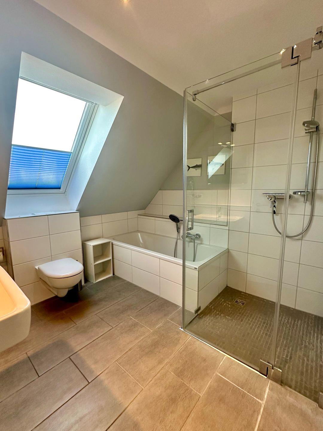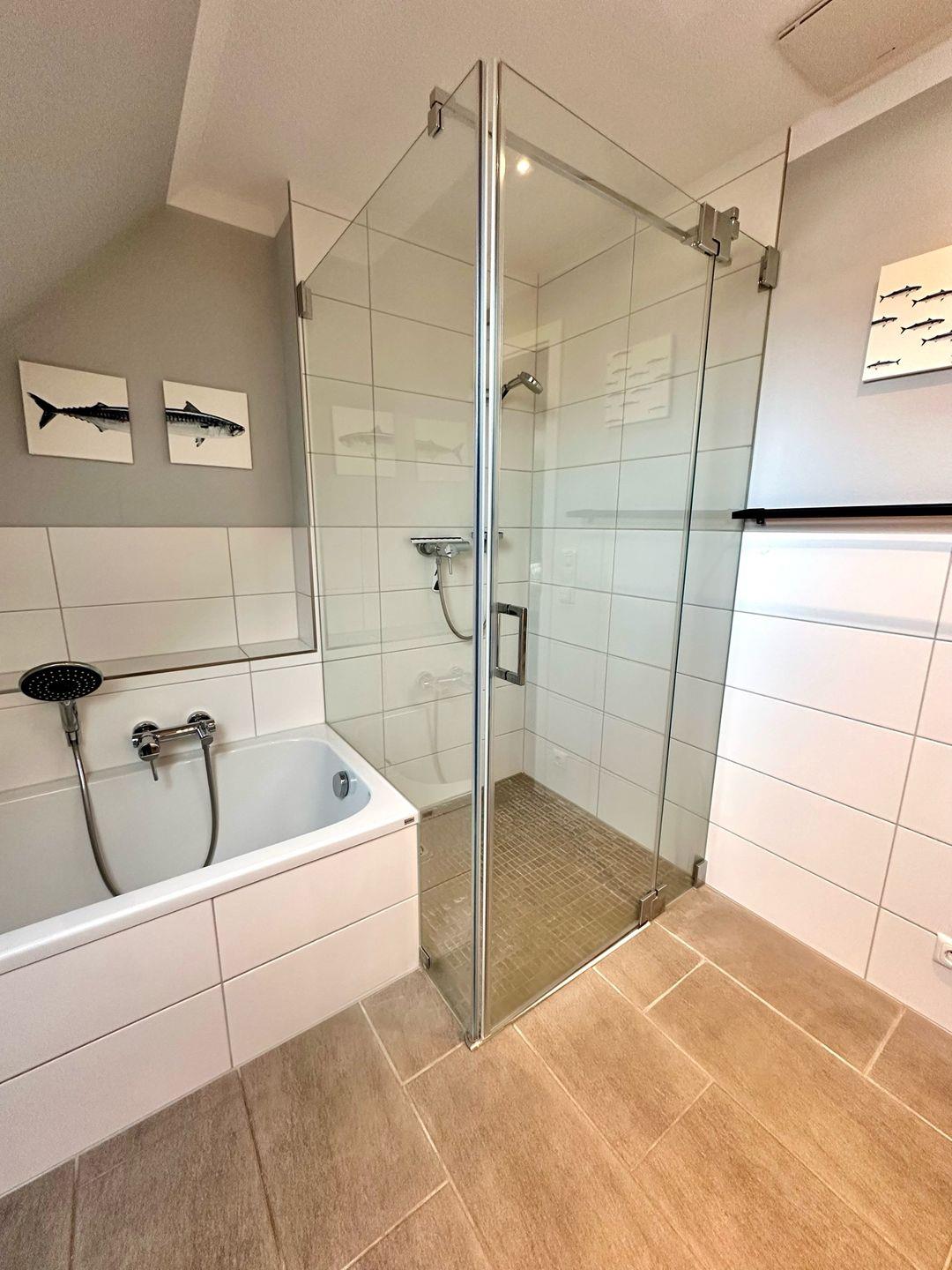 Das Haus verfügt über drei geschmackvoll eingerichtete Schlafzimmer, die allesamt Ruhe und Erholung bieten. Eines der Schlafzimmer ist mit einem Babybett ausgestattet, sodass auch die kleinsten Gäste bei Ihnen willkommen sind. Darüber hinaus sind zwei moderne Badezimmer vorhanden, beide mit bodengleich zugänglicher Dusche, das obere sogar mit einer Badewanne – ideal für entspannende Wellness-Momente nach einem langen Tag.