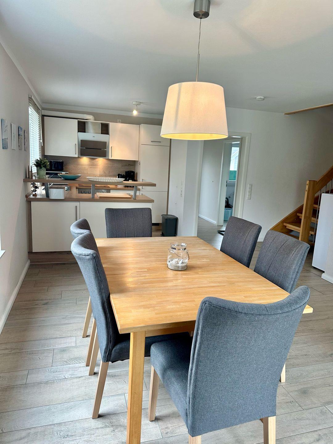 Das Haus überzeugt durch seinen modernen und komfortablen Einrichtungsstil, der sowohl Gemütlichkeit als auch Funktionalität vereint. Bei der Ankunft begrüßt Sie ein helles und freundliches Wohnzimmer, das zum Verweilen einlädt. Hier finden Sie eine komfortable Sofaecke sowie einen Essbereich, ideal für gemeinsame Mahlzeiten. Die Großzügigkeit des Wohnraums wird durch die große Fensterfront unterstrichen, die viel Tageslicht hereinlässt.