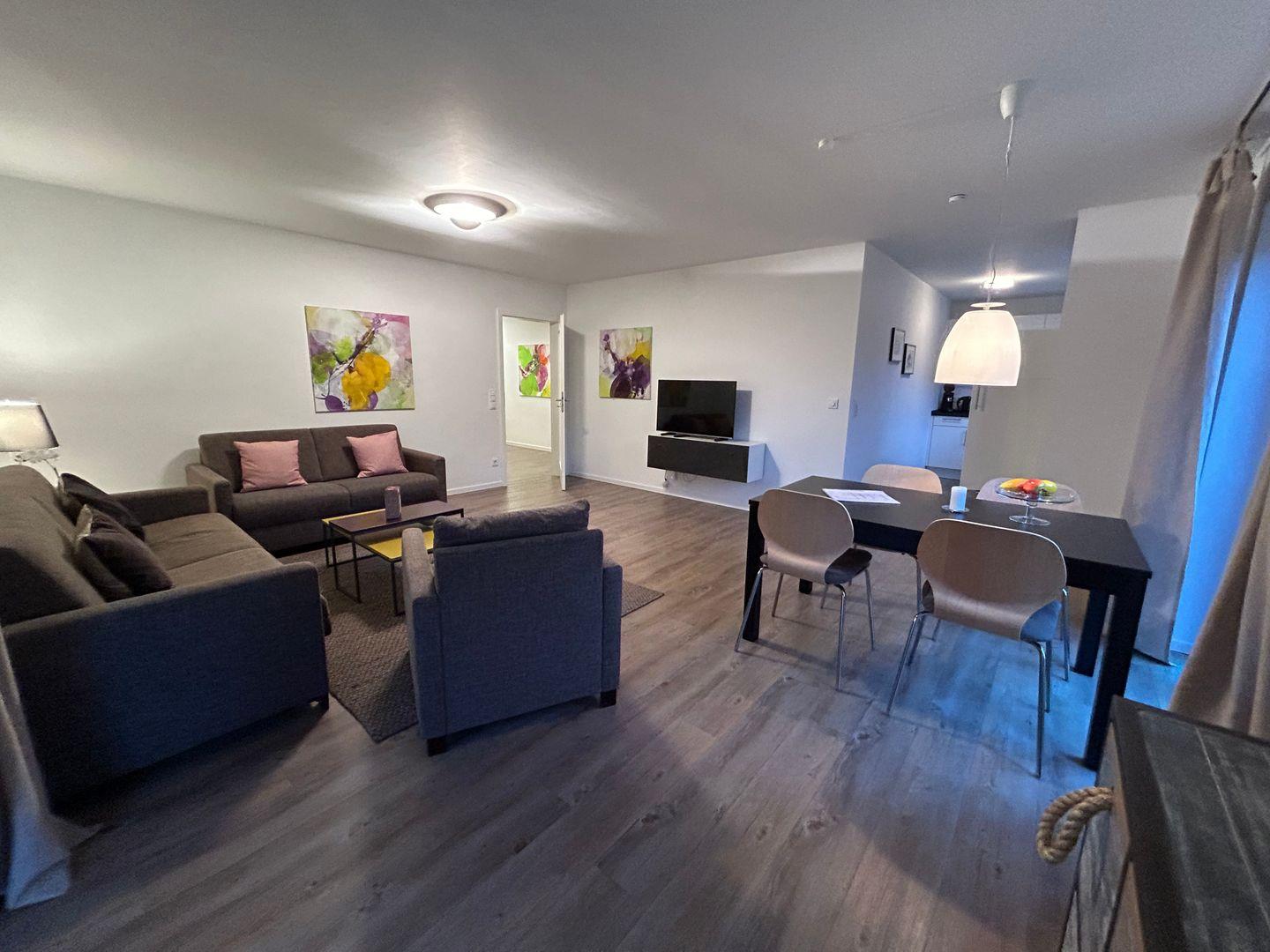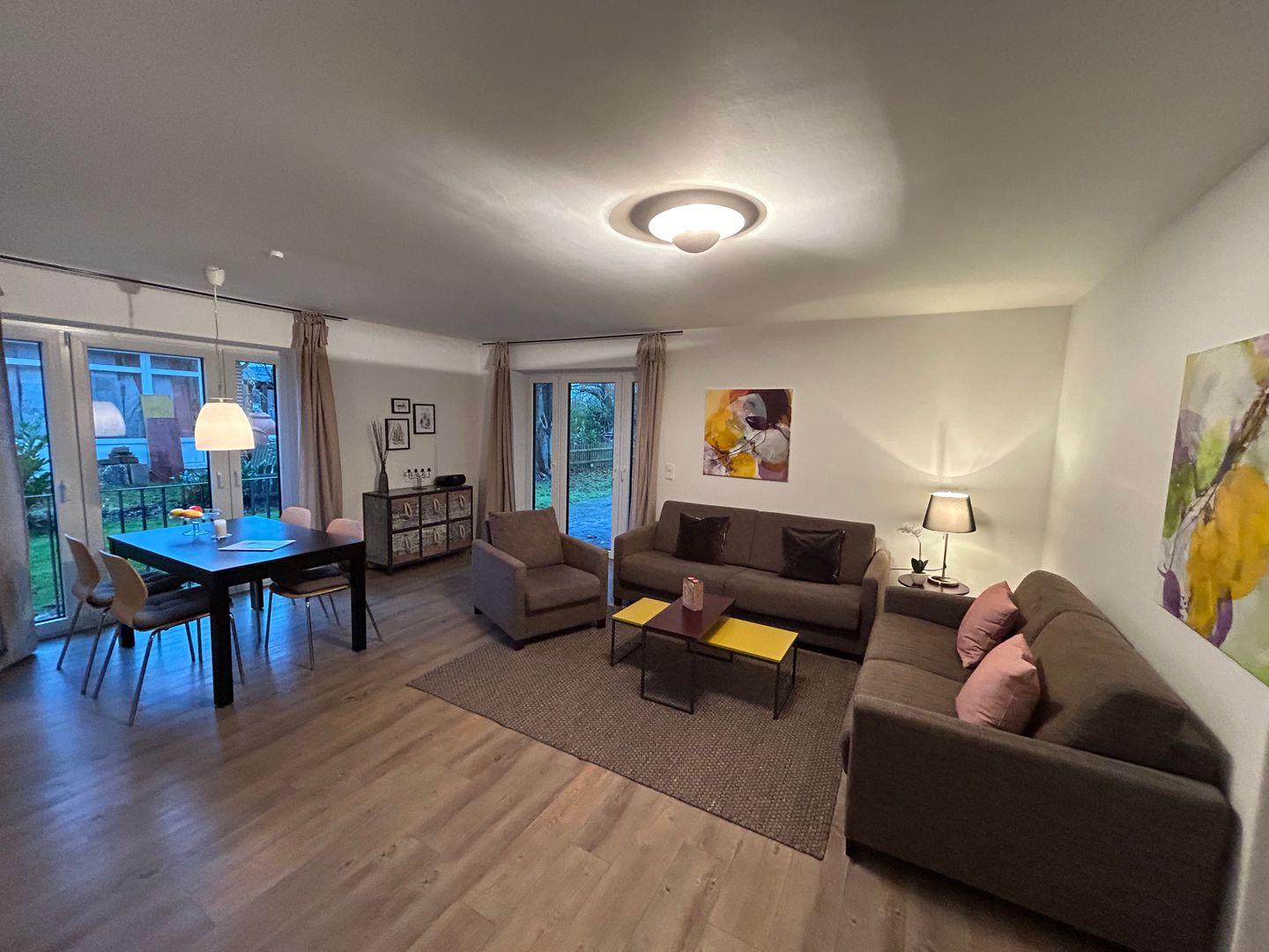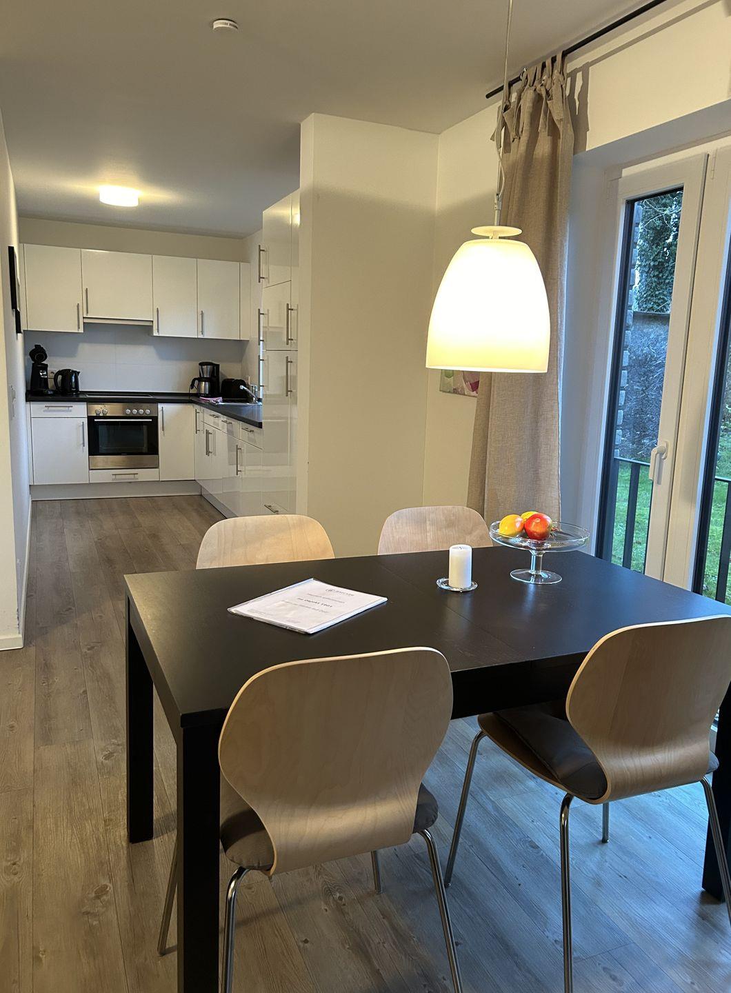 Diese traumhafte Zwei-Zimmer-Ferienwohnung im Erdgeschoss eines Mehrfamilienhauses bietet eine ruhige und idyllische Lage. Der lichtdurchflutete Wohn-/Essbereich mit einer gemütlichen Couch und einer offenen, modernen Küche schafft eine einladende Atmosphäre. Hochwertige Stoffe und erstklassige Einbauten sorgen für ein besonderes Wohlfühlambiente.