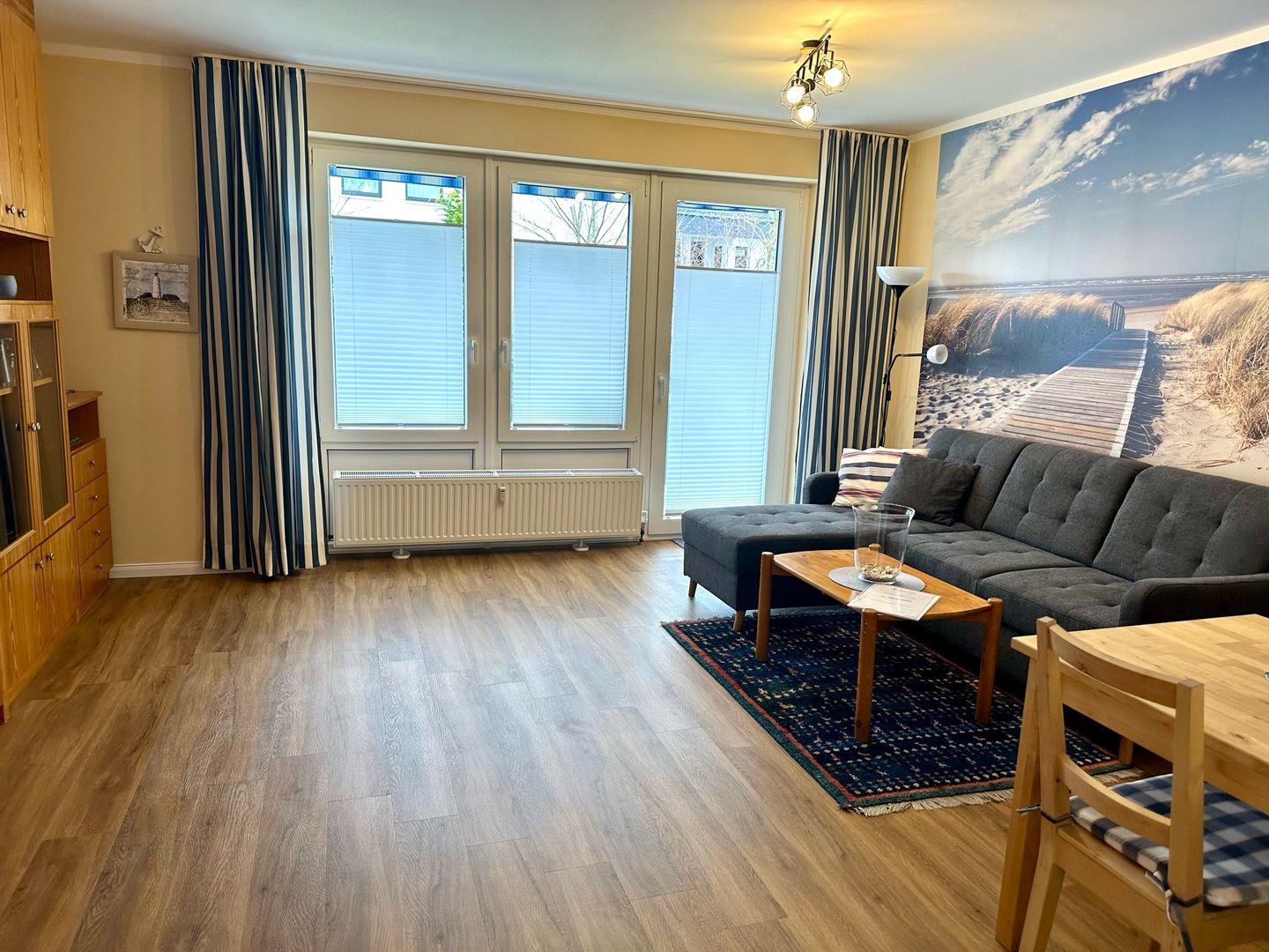 Diese renovierte, zirka 55 m² große zwei Zimmer Wohnung in der Hochparterre mit W-LAN bietet vier Personen Platz. Die Wohnung ist wie folgt aufgeteilt: Flur, ein neues Duschbad mit Föhn, ein Schlafzimmer, eine separate, ganz neue Einbauküche mit Backofen, Geschirrspüler und Kühl-Gefrierkombination, ein Wohn-/Schlafzimmer mit Schrankbett für zwei Personen und Zugang zum großem Süd-/Westbalkon mit Terrassenmöbeln. Zur Wohnung gehört ein fester PKW Stellplatz und im Keller kann gegen eine Gebühr die Waschmaschine genutzt werden. Die kurze Entfernung zum Strand ermöglicht dem Gast einen erholsamen Ostsee-Urlaub! Ihre Fahrräder dürfen Sie gerne in der Fahrradgarage unterstellen. Der perfekte Platz für Ihren geruhsamen Ostseeaufenthalt. Ein kleiner, lieber Hund ist herzlich willkommen!