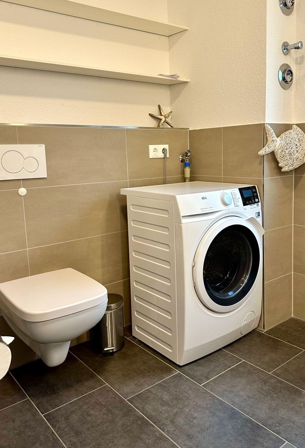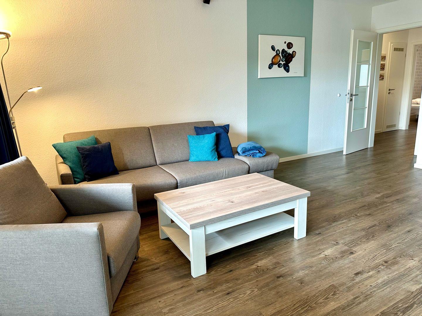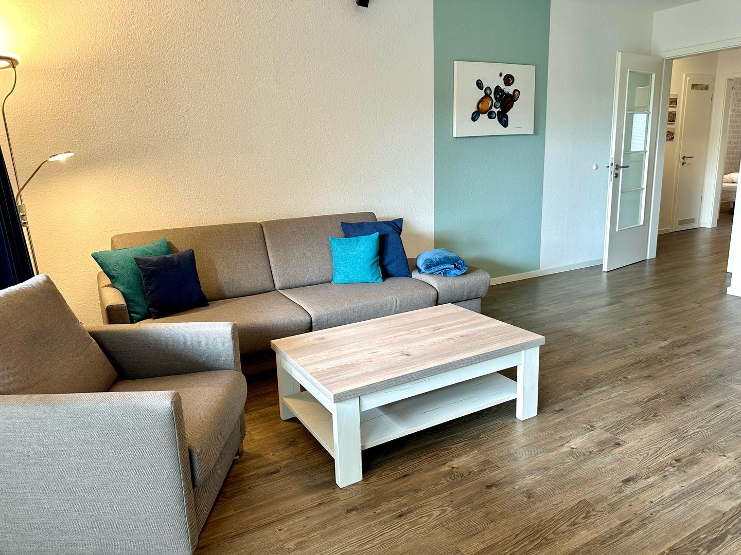Die Wohnung befindet sich im ersten Obergeschoss einer kleinen, gepflegten Wohnanlage und bietet auf 88 m² viel Raum für bis zu sechs Personen. Zwei gemütliche Schlafzimmer (eins mit hochwertigem Boxspringbett, eins mit zwei Einzelbetten) und ein großzügiges Wohn-/Esszimmer mit Schlafcouch und offener, voll ausgestatteter Küche sorgen für Wohlfühlatmosphäre. Der möblierte Balkon mit Gartenblick lädt zu entspannten Stunden ein – vielleicht mit einem Glas Wein nach einem Tag am Meer?