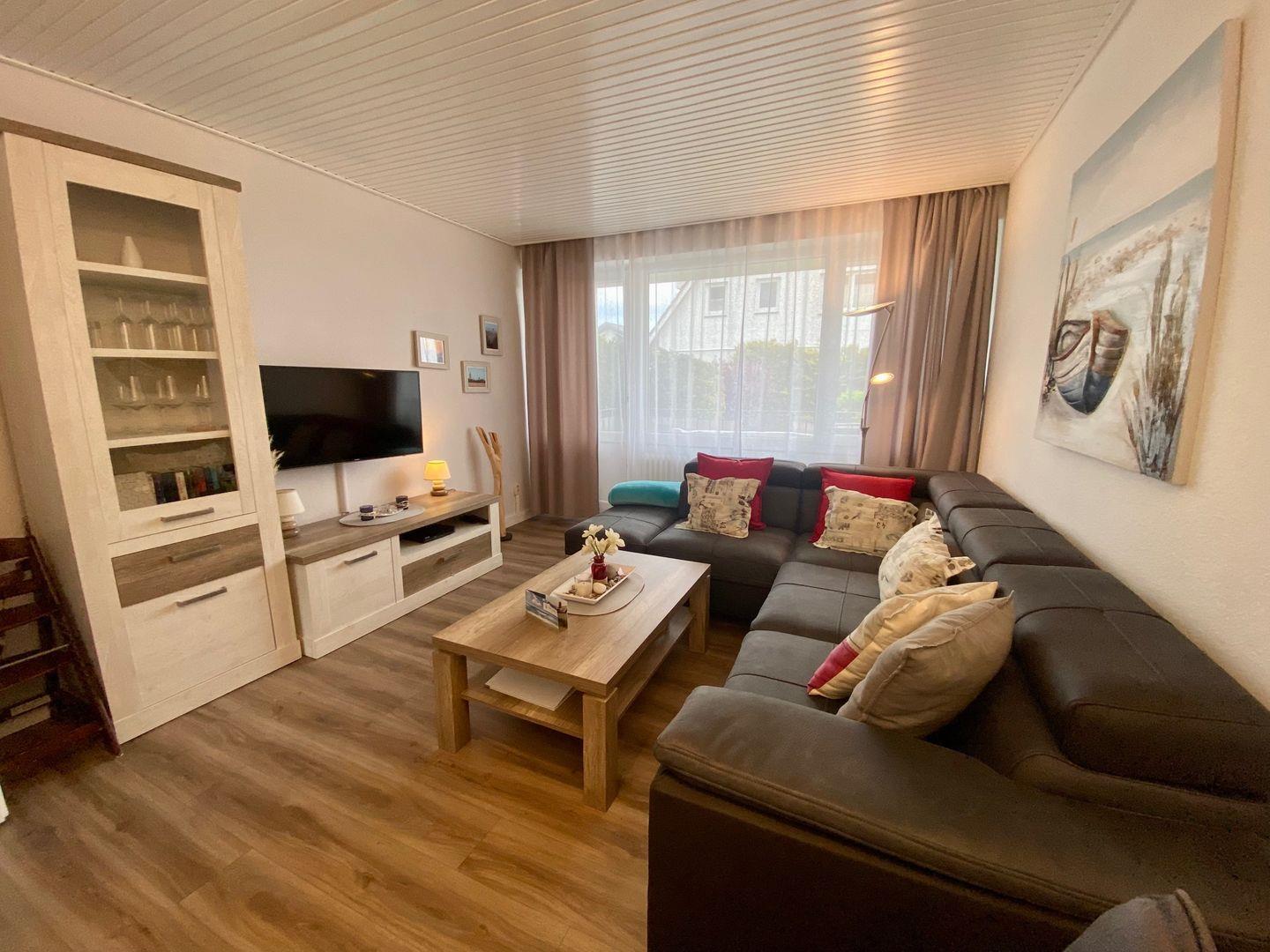 Herzlich Willkommen.... Stilvolle, besonders familien- und kinderfreundliche Maisonettewohnung mit zirka 80 m² Wohnfläche auf zwei Ebenen und Platz für bis zu sechs Personen. Die Wohnung bietet zwei voneinander unabhängige Bereiche. Beide Schlafzimmer im unteren Geschoss (Souterrain) sind mit Flachbildfernsehern ausgestattet. Das große Schlafzimmer ist zusätzlich mit einer Sitzecke ausgestattet, so dass man auch mal einen ruhigen Abend zu zweit verbringen kann. Das Wohnzimmer im Parterre verfügt über eine gemütliche Schlafcouch inkl. Topper, einen großen Flachbildfernseher und bietet Zugang zu dem Balkon. Die Wohnung hat auf beiden Ebenen jeweils ein ansprechendes Duschbad, in der Küche befinden sich Herd, Mikrowelle, Toaster, Wasserkocher sowie Kaffeemaschine. Zur Ferienwohnung gehören ferner zwei PKW-Stellplätze am Haus sowie eine Münzwaschmaschine im Keller des Hauses. Bis zu zwei Hunde sind herzlich willkommen.