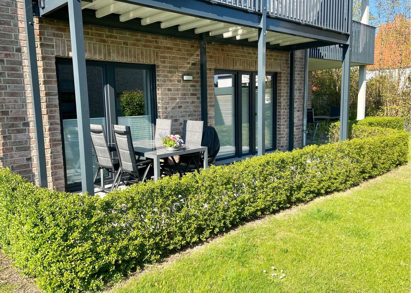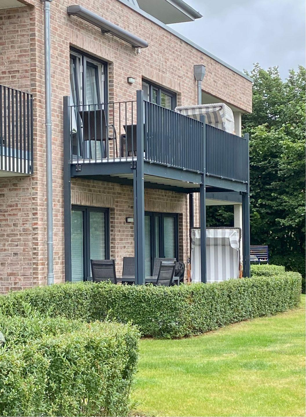 Moderne, barrierefreie Ferienwohnung in Dahme, nur 150 Meter vom Strand entfernt, mit Südterrasse und Strandkorb.