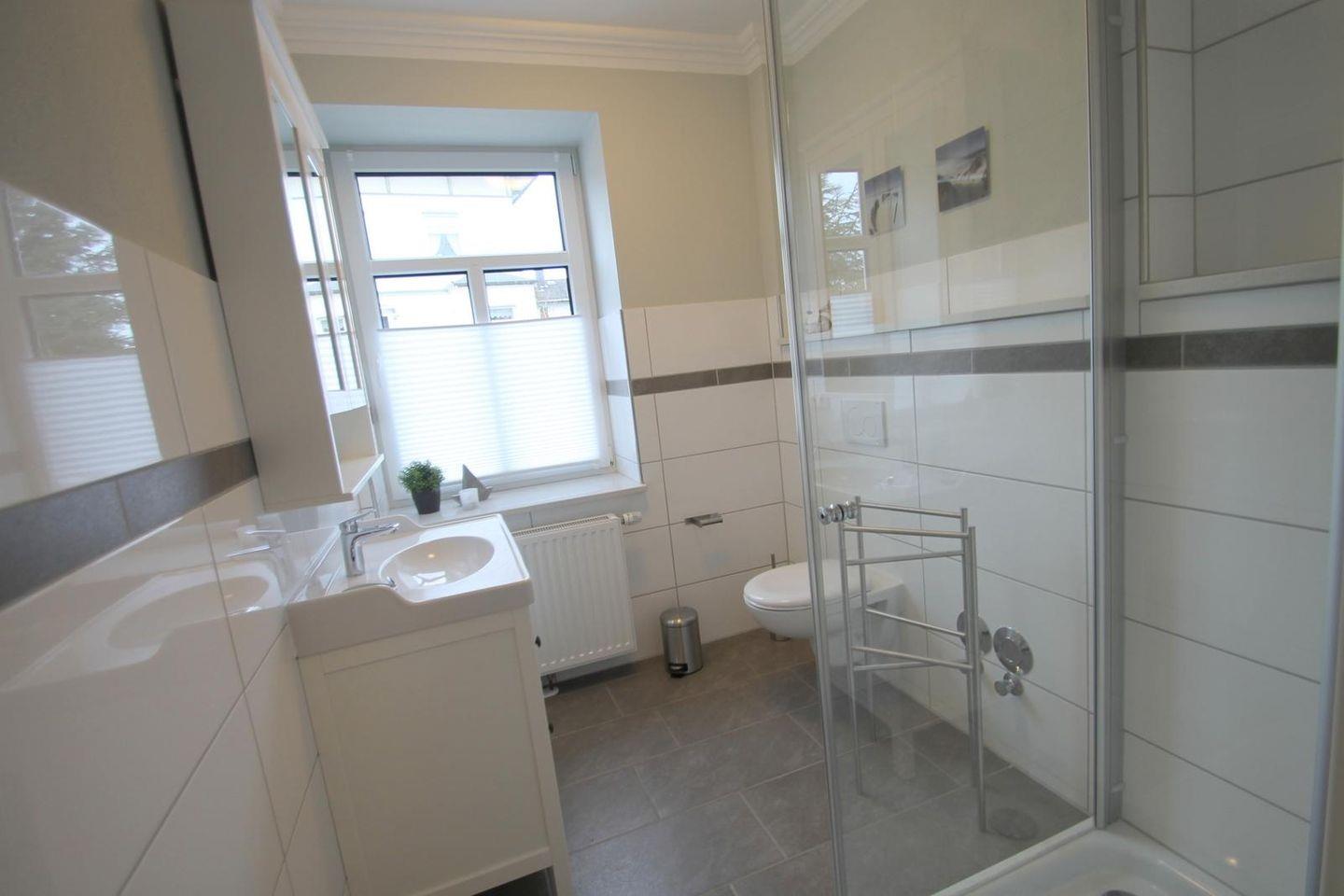 Das Badezimmer mit Fenster ist mit einer bodengleichen Dusche ausgestattet, die einen einfachen Zugang für alle Gäste ermöglicht. Hier erwarten Sie zudem das Waschbecken, WC und Spiegel. Um Ihrem Wohlbefinden gerecht zu werden, ist die gesamte Unterkunft ein Nichtraucherbereich und bietet Ihnen warmes Wasser sowie eine Heizung für die frischen Abende.