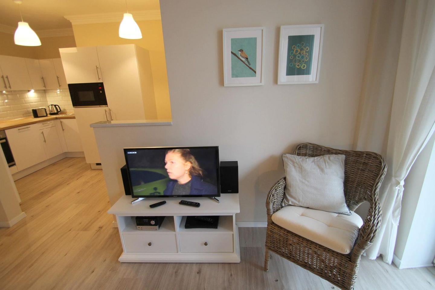 Auf einer großzügigen Fläche von 65 m² überzeugt die Unterkunft mit einem funktionalen und modernen Design, das den Gästen sowohl Gemütlichkeit als auch praktische Annehmlichkeiten bietet. Sie besteht aus insgesamt drei Zimmern, darunter zwei behagliche Schlafzimmer - einmal mit Doppelbett (2 x 90x200 cm) und einmal mit Einzelbett und massivem Doppelstockbett (für Erwachsene geeignet), die für bis zu fünf Personen Schlafmöglichkeiten bieten. Das liebevoll gestaltete Wohnzimmer ist offen zur voll ausgestatteten Küche, in der Sie zahlreiche Annehmlichkeiten finden: einen Cerankochfeld-Herd, Backofen, Mikrowelle, Kühlschrank mit Gefrierfach und Geschirrspüler. Hier können Sie im Handumdrehen schmackhafte Mahlzeiten zubereiten und diese im Essbereich oder auf der schönen Terrasse mit Gartenmöbeln genießen.