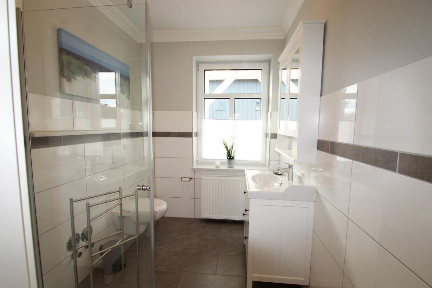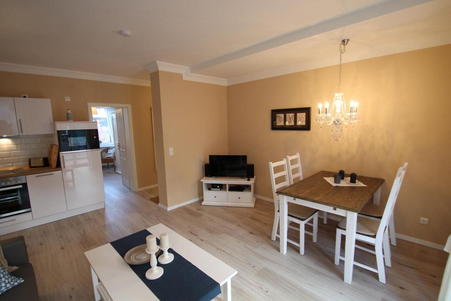 Haus im Stil der Bäderarchitektur. Ferienwohnung im Erdgeschoss mit Terrasse. Über den Eingangsflur gelangen Sie in den Wohnbereich mit offener Küche. Zur Wohnung gehören zwei separate Schlafzimmer - einmal mit Doppelbett (2 x 90x200 cm) und einmal mit zwei Einzelbetten (90x200 cm). Ein separates Tageslichtduschbad und ein Abstellraum ergänzen diese im Landhausstil eingerichtete Wohnung. PKW-Stellplatz auf dem Grundstück. Im Nebengebäude haben die Hausgäste die Möglichkeit die Waschmaschine und den Trockner gegen Gebühr zu nutzen. Ein lieber Hund ist herzlich willkommen.
