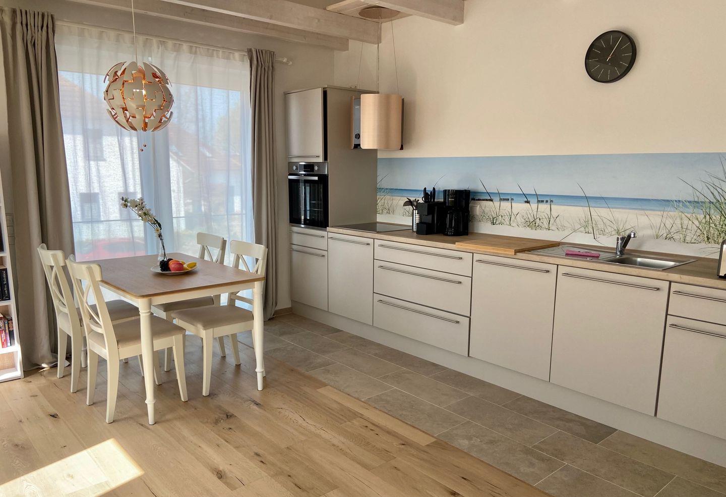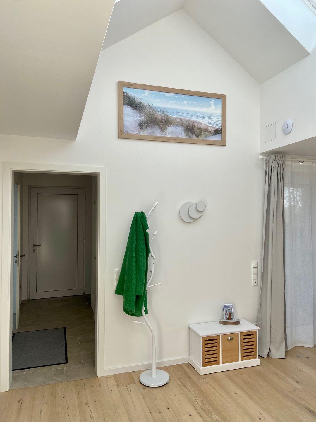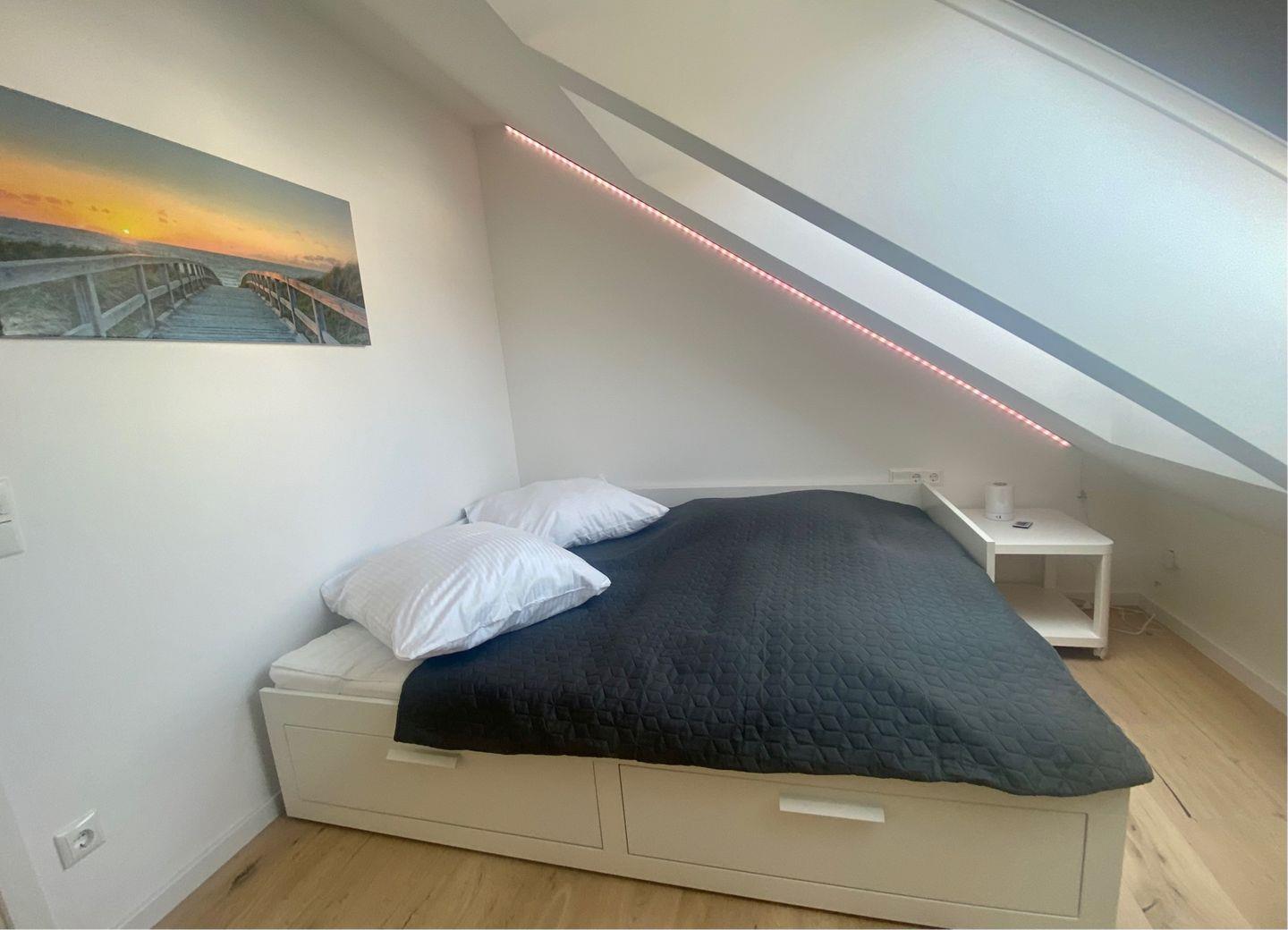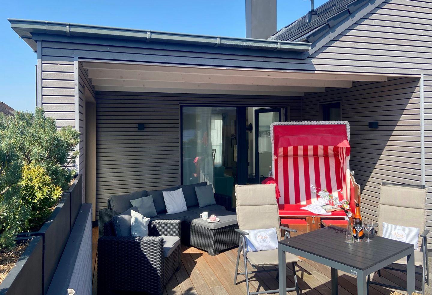 Genießen Sie in der stilsicher eingerichteten Ferienwohnung im Obergeschoss in einer Wohneinheit mit vier Ferienwohnungen Ihren Urlaub. Diese 3-Zimmer-Neubauwohnung mit großer Dachterrasse überzeugt auf über 100 m² mit jeglichem Komfort. Die 3 Zimmer bieten Platz für bis zu 4 Personen. Die Ferienwohnung überzeugt durch eine moderne und hochwertige Ausstattung. Kleine maritime Akzente spiegeln mit viel Liebe zum Detail die Nähe zum Meer wieder. Das leichte Farbschema in der Ferienwohnung wirkt durch die Aufteilung im Raum, frisch aber dennoch gemütlich. Sehr bequeme Couchlandschaft und Kaminofen für kalte Wintertage. Der Wohnraum ist zur Küche hin offen gestaltet und die vielen Fenster im Dachgeschoss lassen die Wohnung noch größer erscheinen, als sie schon ist. Zwei Schlafzimmer - das Elternschlafzimmer mit Doppelbett (1 x 180x200 cm) und das Kinderzimmer mit Tagesbett wo im Handumdrehen Platz für Übernachtungsgäste geschaffen wird. Einfach die Liegefläche herausziehen und schon haben Sie ein bequemes Doppelbett (2 x 80x200 cm)! Selbstverständlich können Sie die Veluxfenster in den Schlafzimmern verdunkeln. Ein Wohlfühlbad mit bodengleicher Dusche und ein Gäste-WC gehören ebenfalls zur Wohnung. Besonderes Highlight dieser Wohnung ist zweifelsohne die ca. 30 m² große Dachterrasse in Südwest-Sonnenlage - ebenfalls mit Strandkorb und Lounge-Möbeln. Ein PKW-Stellplatz vor dem Haus gehört zu dieser Wohnung. Ihre mitgebrachten Fahrräder können Sie im Garten abstellen. Ein gemütlicher Grillplatz im Garten lädt zum Verweilen ein. Und sollten Sie doch mal arbeiten wollen, finden Sie im Schlafzimmer einen Schreibtisch mit LAN-Kabel. Der WLAN-Anschluss ist inklusive. Ein Kinderbett und ein Kinderhochstuhl sowie ein Bollerwagen für die kleinen Gäste gehören zur Grundausstattung. Für Ihren PKW steht Ihnen eine Wallbox zum Laden Ihres E-Autos gegen eine Tagespauschale in Höhe von 10,- € zur Verfügung. Die Pauschale kann nur für den gesamten Aufenthalt dazu gebucht werden. Sprechen Sie uns für weitere Informationen gerne an.