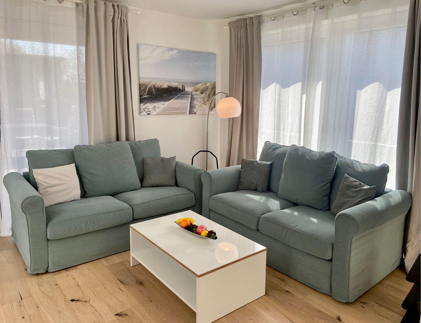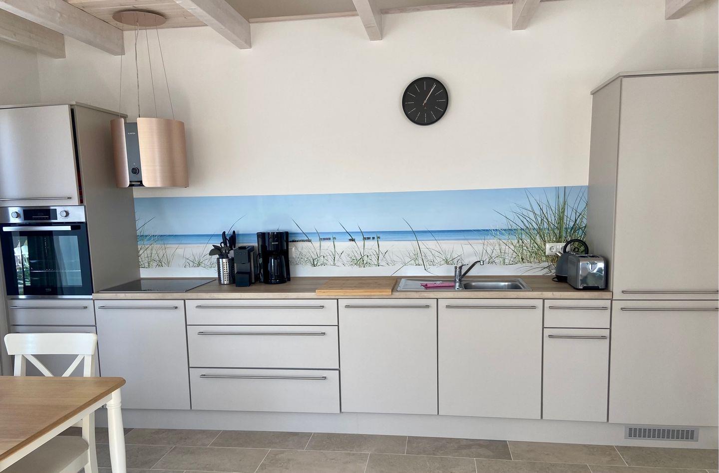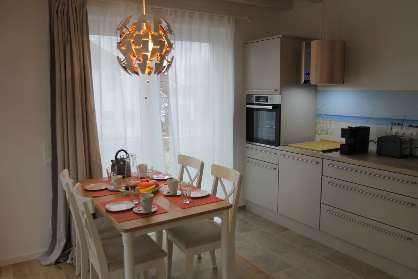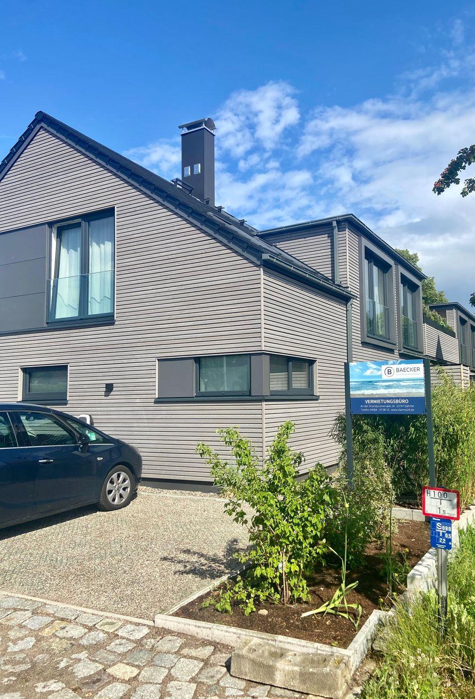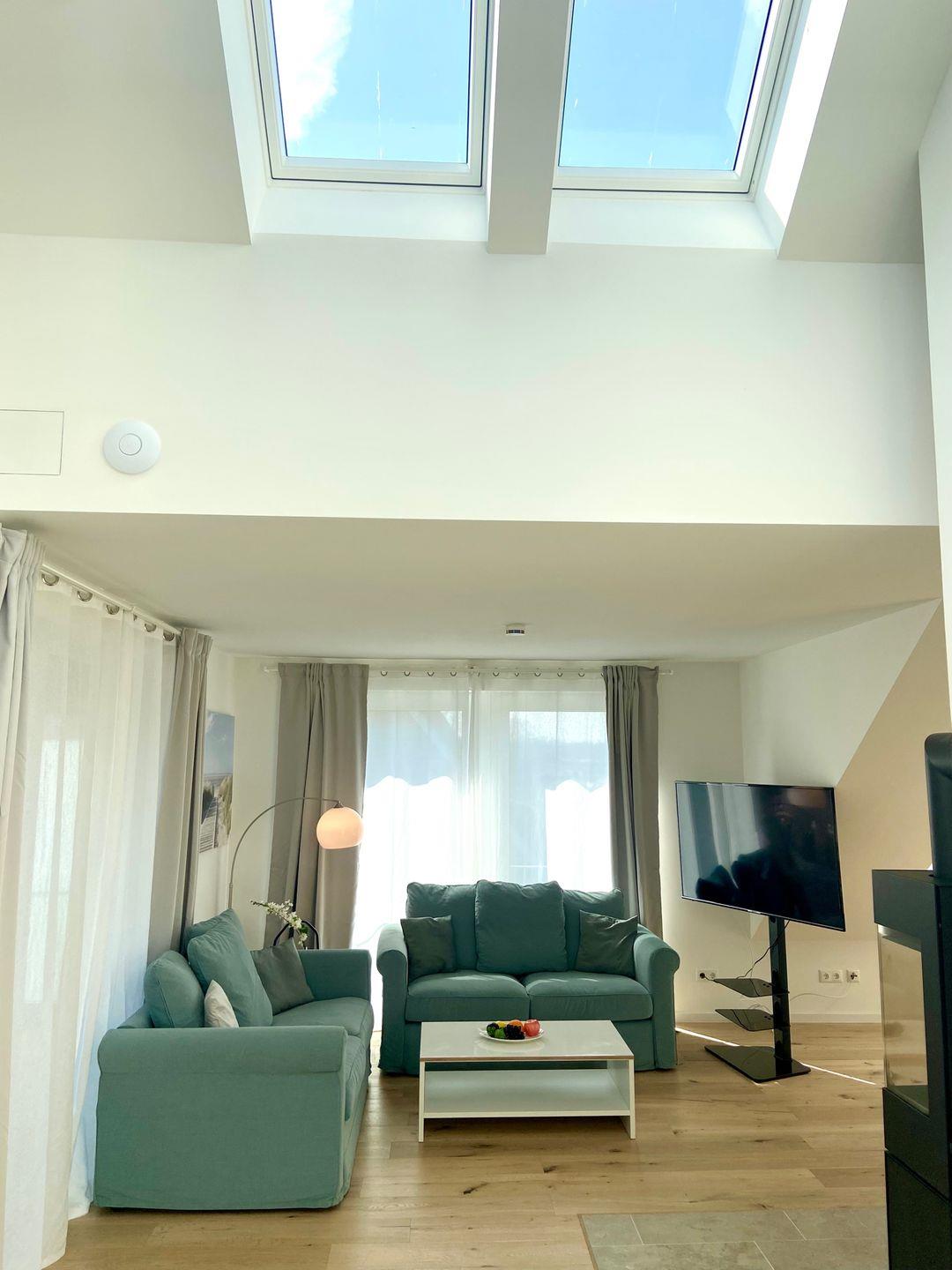 Genießen Sie in der stilsicher eingerichteten Ferienwohnung im Obergeschoss in einer Wohneinheit mit vier Ferienwohnungen Ihren Urlaub. Diese 3-Zimmer-Neubauwohnung mit großer Dachterrasse überzeugt auf über 100 m² mit jeglichem Komfort. Die 3 Zimmer bieten Platz für bis zu 4 Personen. Die Ferienwohnung überzeugt durch eine moderne und hochwertige Ausstattung. Kleine maritime Akzente spiegeln mit viel Liebe zum Detail die Nähe zum Meer wieder. Das leichte Farbschema in der Ferienwohnung wirkt durch die Aufteilung im Raum, frisch aber dennoch gemütlich. Sehr bequeme Couchlandschaft und Kaminofen für kalte Wintertage. Der Wohnraum ist zur Küche hin offen gestaltet und die vielen Fenster im Dachgeschoss lassen die Wohnung noch größer erscheinen, als sie schon ist. Zwei Schlafzimmer - das Elternschlafzimmer mit Doppelbett (1 x 180x200 cm) und das Kinderzimmer mit Tagesbett wo im Handumdrehen Platz für Übernachtungsgäste geschaffen wird. Einfach die Liegefläche herausziehen und schon haben Sie ein bequemes Doppelbett (2 x 80x200 cm)! Selbstverständlich können Sie die Veluxfenster in den Schlafzimmern verdunkeln. Ein Wohlfühlbad mit bodengleicher Dusche und ein Gäste-WC gehören ebenfalls zur Wohnung. Besonderes Highlight dieser Wohnung ist zweifelsohne die ca. 30 m² große Dachterrasse in Südwest-Sonnenlage - ebenfalls mit Strandkorb und Lounge-Möbeln. Ein PKW-Stellplatz vor dem Haus gehört zu dieser Wohnung. Ihre mitgebrachten Fahrräder können Sie im Garten abstellen. Ein gemütlicher Grillplatz im Garten lädt zum Verweilen ein. Und sollten Sie doch mal arbeiten wollen, finden Sie im Schlafzimmer einen Schreibtisch mit LAN-Kabel. Der WLAN-Anschluss ist inklusive. Ein Kinderbett und ein Kinderhochstuhl sowie ein Bollerwagen für die kleinen Gäste gehören zur Grundausstattung. Für Ihren PKW steht Ihnen eine Wallbox zum Laden Ihres E-Autos gegen eine Tagespauschale in Höhe von 10,- € zur Verfügung. Die Pauschale kann nur für den gesamten Aufenthalt dazu gebucht werden. Sprechen Sie uns für weitere Informationen gerne an.