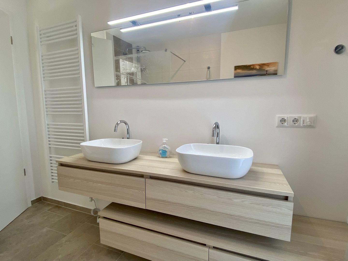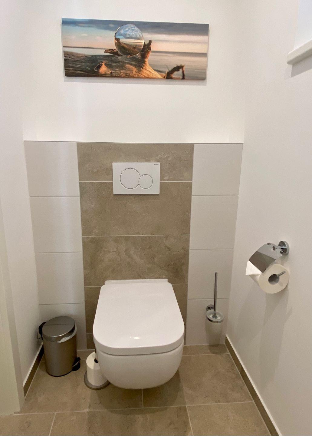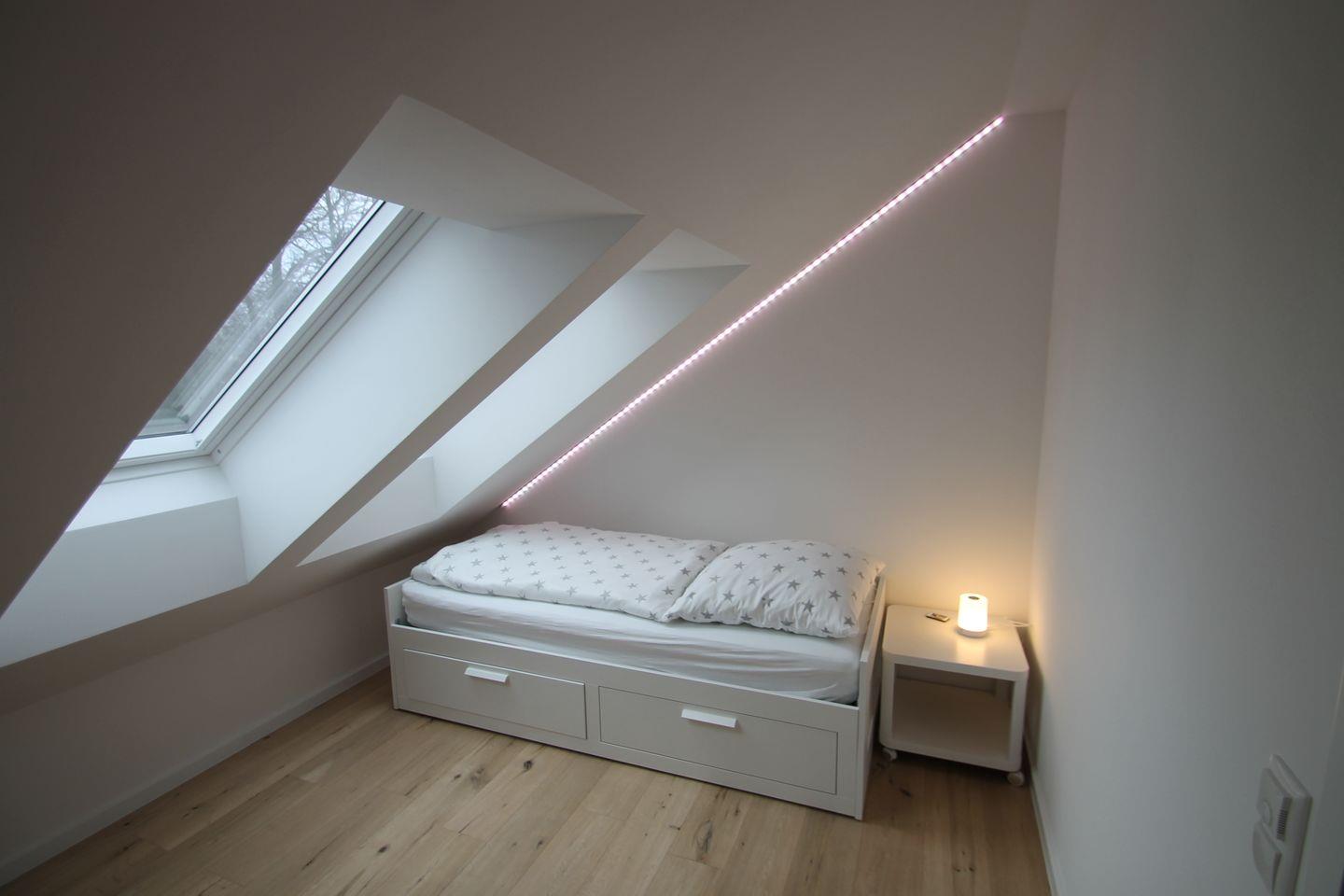 das Elternschlafzimmer mit Doppelbett (1 x 180x200 cm) und das Kinderzimmer mit Tagesbett wo im Handumdrehen Platz für Übernachtungsgäste geschaffen wird. Einfach die Liegefläche herausziehen und schon haben Sie ein bequemes Doppelbett (2 x 80x200 cm)!! Selbstverständlich können Sie die Veluxfenster in den Schlafzimmern verdunkeln. Ein Wohlfühlbad mit bodengleicher Dusche und ein Gäste-WC gehören ebenfalls zur Wohnung. Besonderes Highlight dieser Wohnung ist zweifelsohne die zirka 30 m² große Dachterrasse mit Lounge Möbeln und einem Strandkorb in Südwest-Sonnenlage. Der PKW-Stellplatz vor dem Haus gehört zu dieser Wohnung. Ihre mitgebrachten Fahrräder können Sie im Garten abstellen. Ein Kinderbett und ein Kinderhochstuhl sowie ein Bollerwagen für die kleinen Gäste gehören zur Grundausstattung.