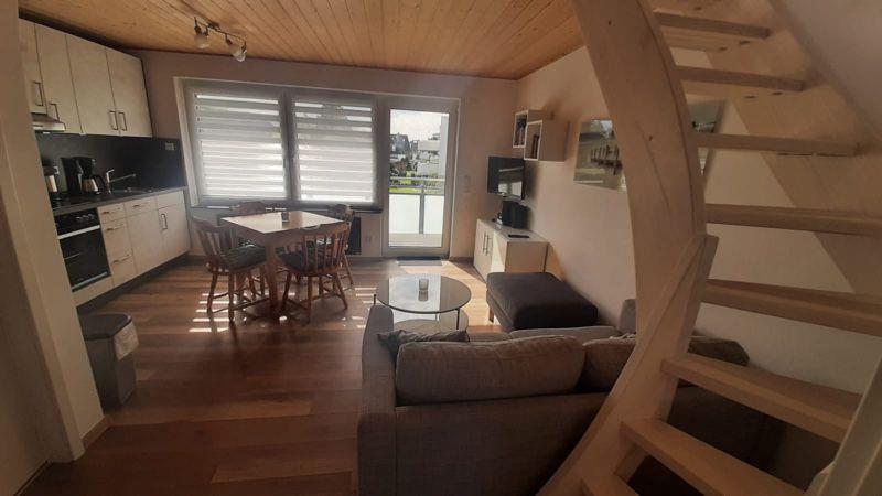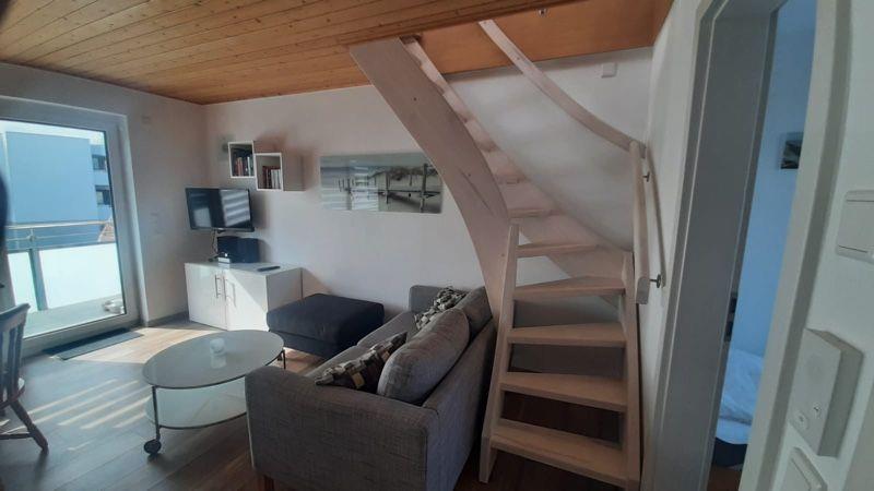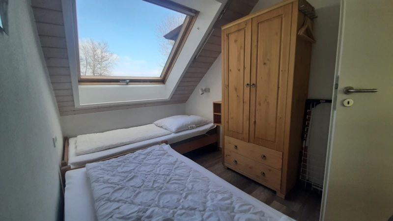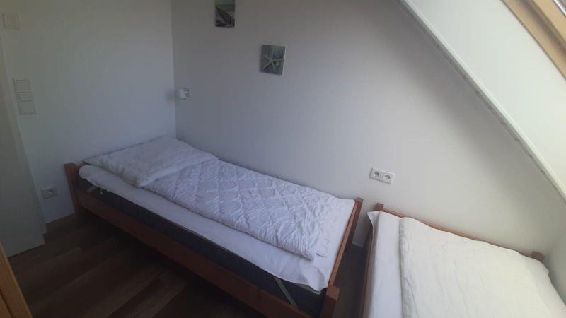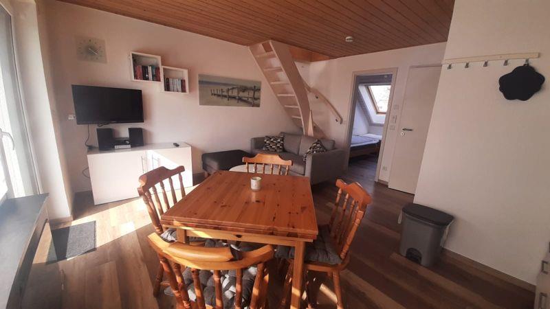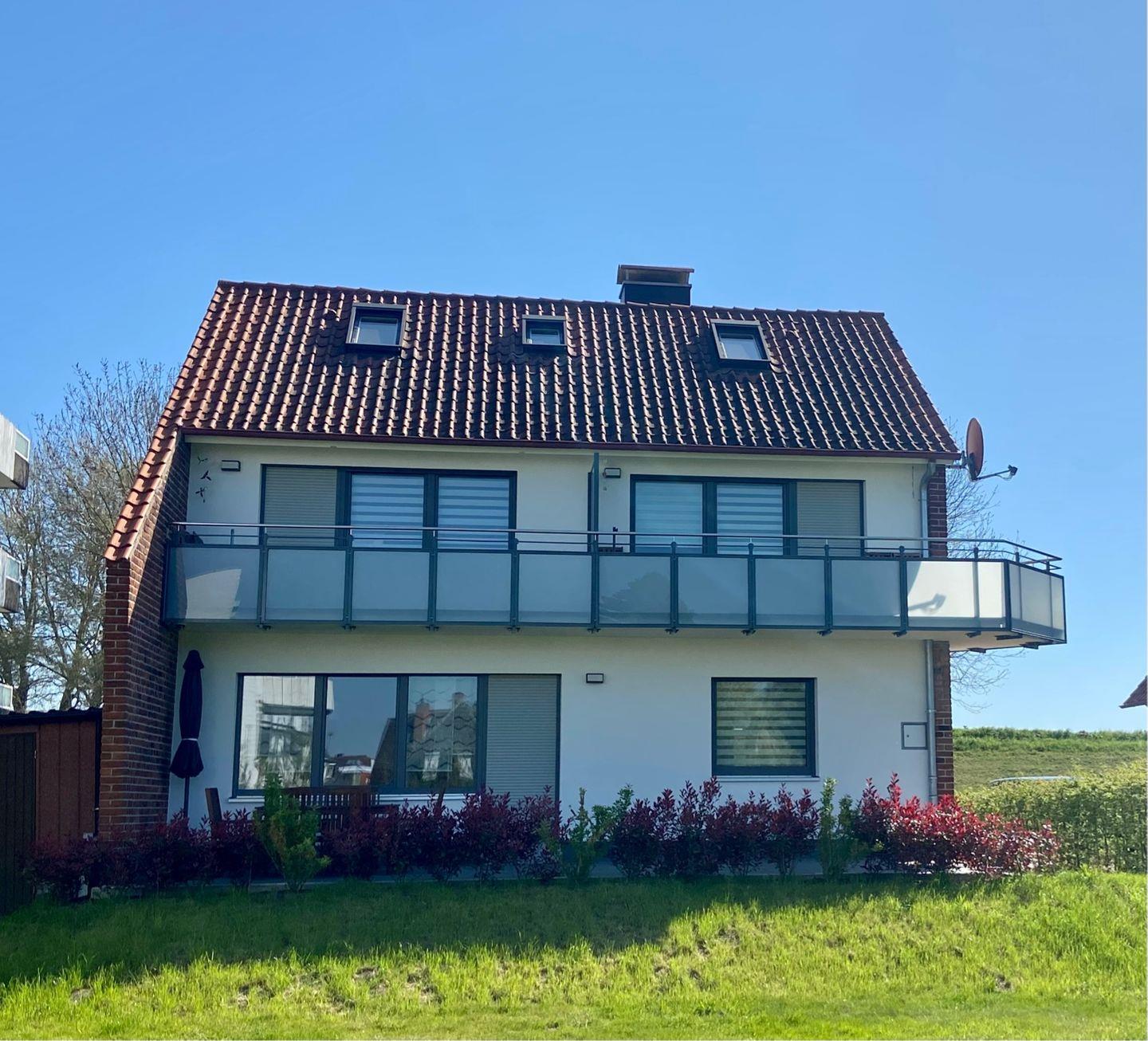 Strandnahe Ferienwohnung direkt am Deich im 1. OG eines 3-Familienhauses für 2-4 Personen. Zum Strand sind es nur ca. 50 Meter zu Fuß. Die Wohnung verfügt über zwei Schlafzimmer - Achtung das Doppelbett befindet sich im Spitzboden und ist nur über eine steile Raumspartreppe erreichbar. Ein zweites Schlafzimmer mit zwei Einzelbetten ( ein Bett mit einer länge von 1,90 m und ein Bett mit einer länge von 2,00 m) gehört ebenfalls zu dieser Wohnung. Sämtliche Fenster haben Rollläden. Die Küche ist offen in den Wohnraum integriert. Der möblierte Balkon ist nach Südwest ausgerichtet und daher herrlich sonnig. Das Bad wurde im Jahr 2022 komplett renoviert und modernisiert. Diese Wohnung ist gemütlich eingerichtet und auch eine 4-köpfige Familie wird sich hier wohlfühlen. Auf dem Grundstück sind ausreichend PKW-Stellplätze vorhanden.