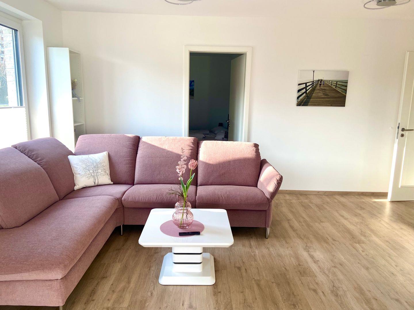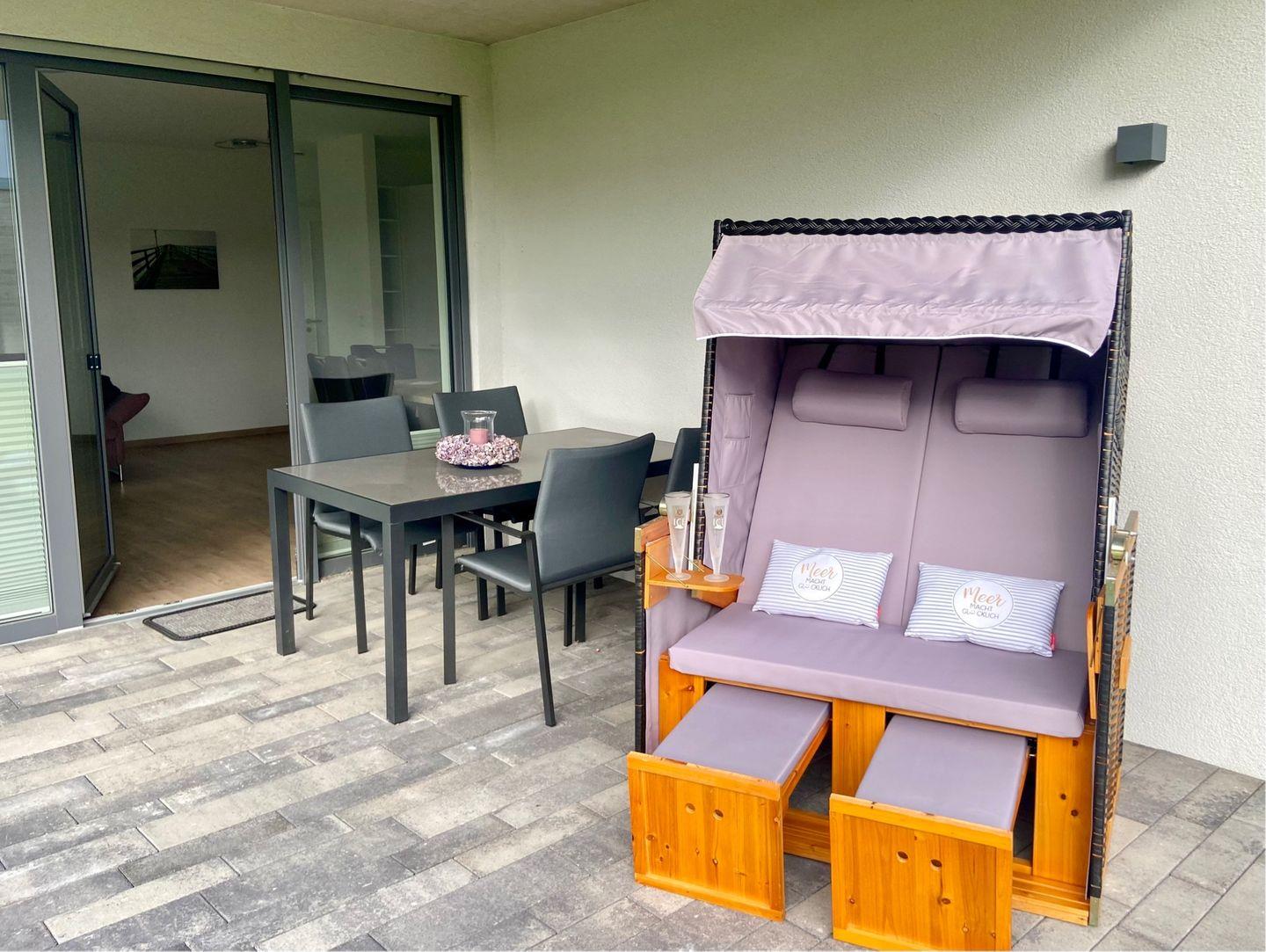 Moderne, barrierefreie Ferienwohnung in Dahme, nur 100 m vom Strand mit Terrasse und Strandkorb.