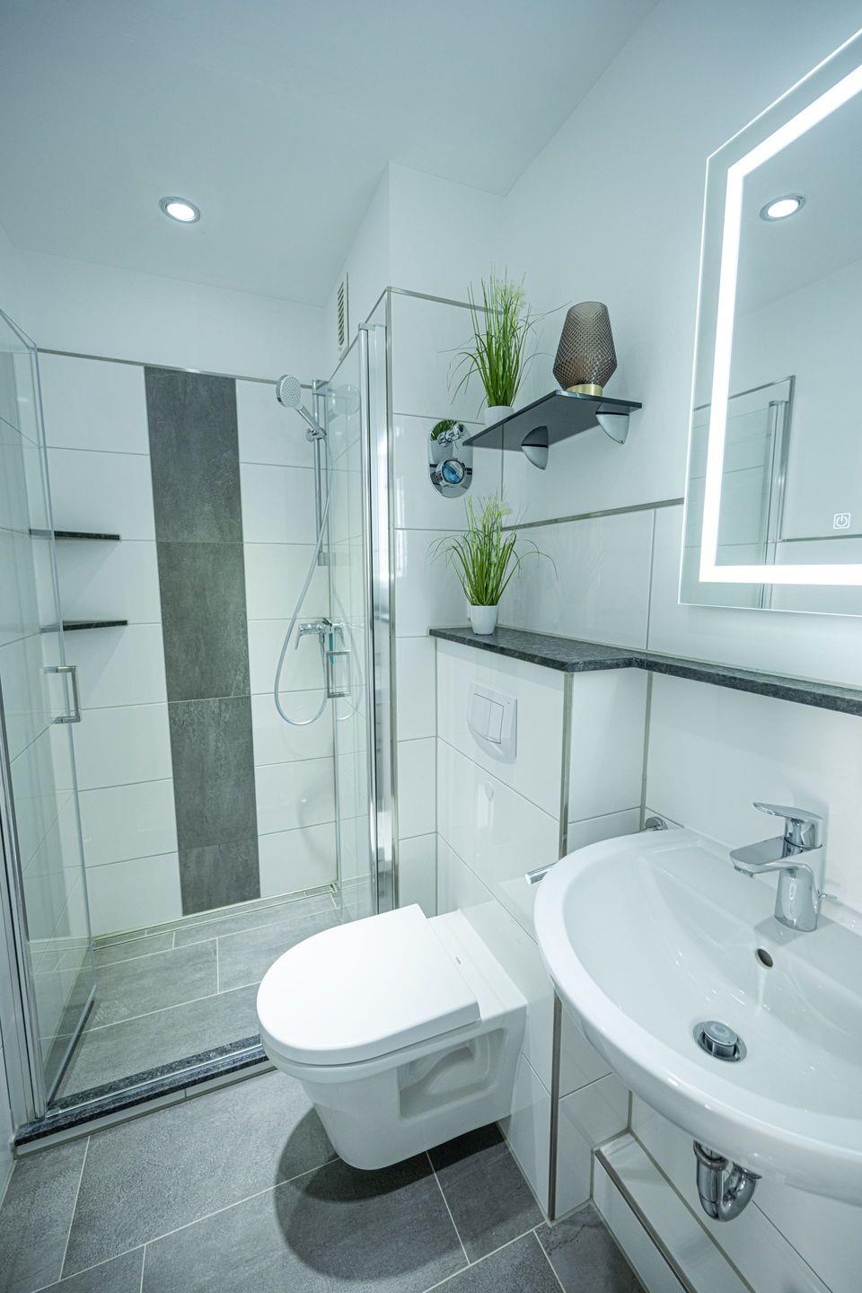 - Badezimmer mit Dusche, WC und Spiegelschrank