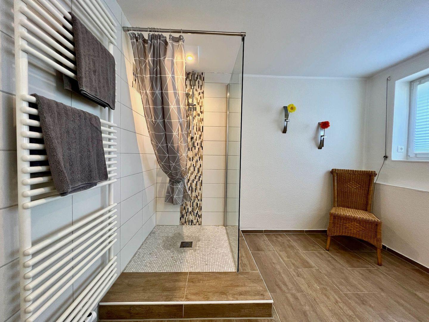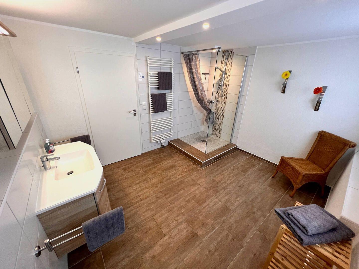 - großes tageslichthelles Badezimmer mit Dusche, WC und Fußbodenheizung