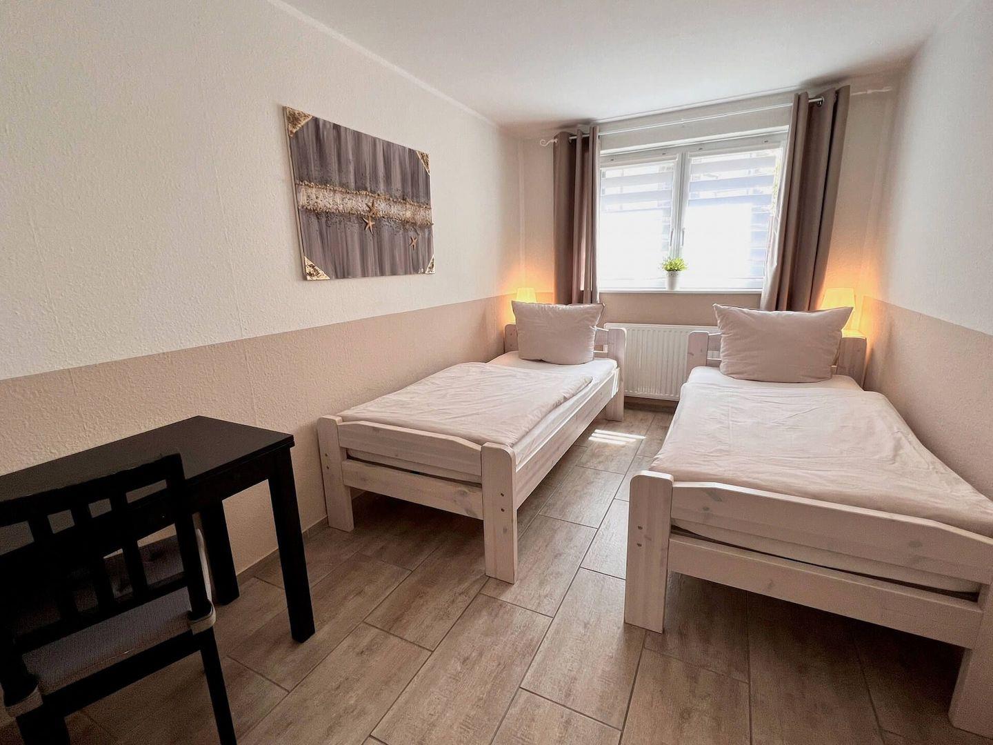 - ein Schlafzimmer mit 2 Einzelbett, Kleiderschrank und Schreibtisch