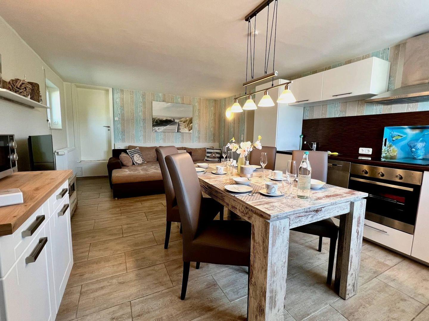 - Wohn-, Esszimmer mit integrierter voll ausgestatteter Küche mit Geschirrspüler und Backofen