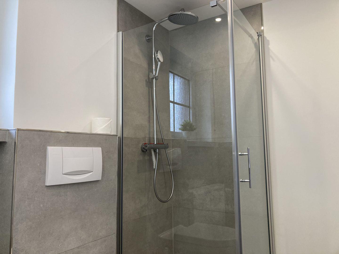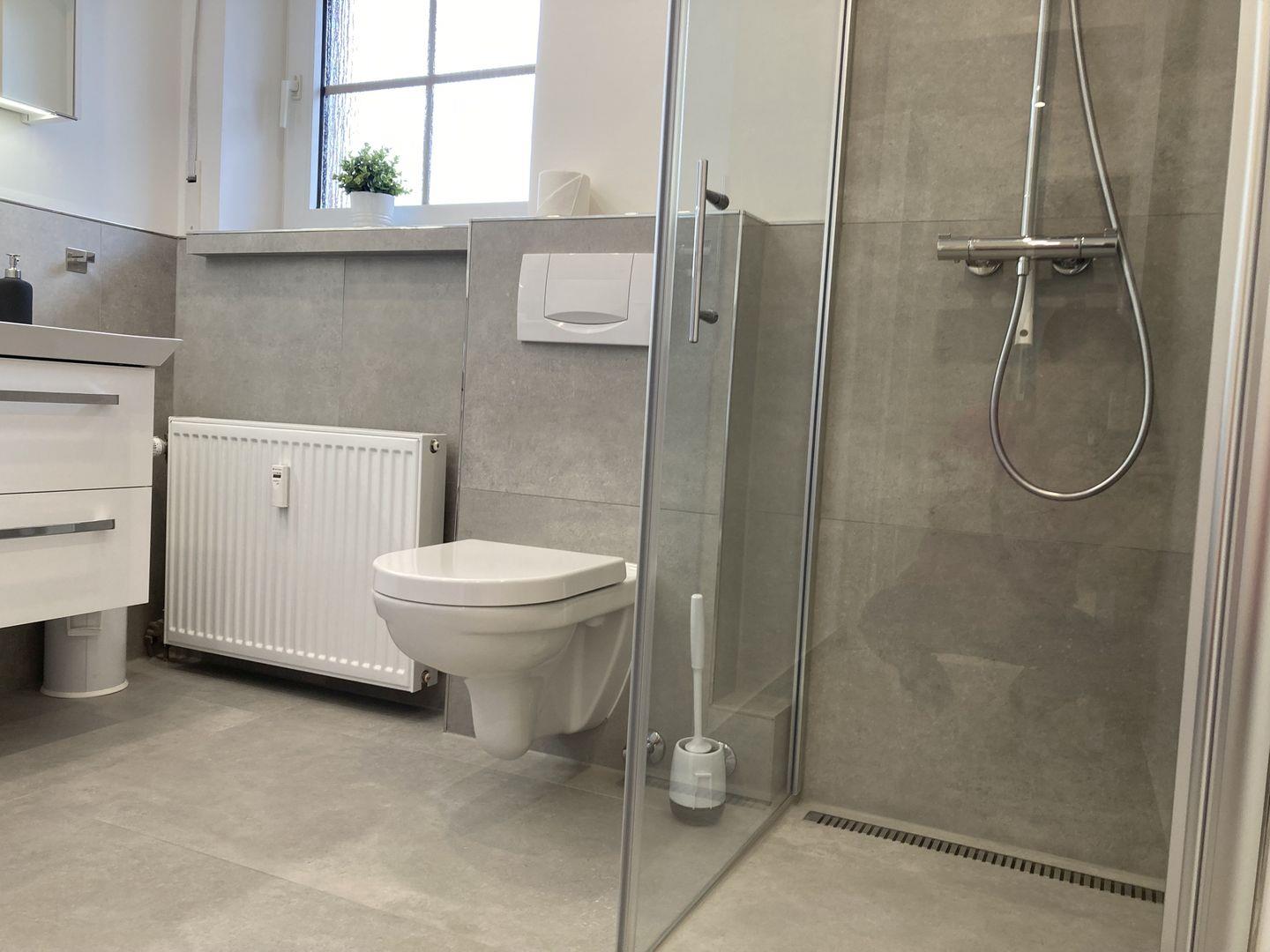 - ein helles Badezimmer mit Dusche, WC und Föhn