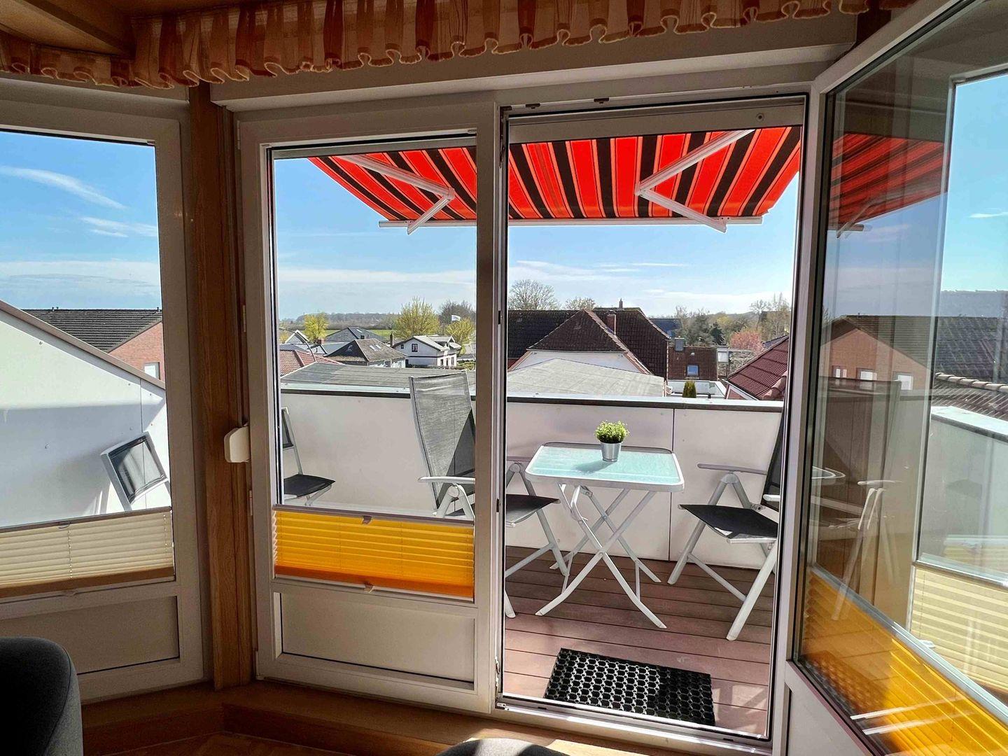 - Zugang auf den überdachten und möblierten Balkon vom Wohnzimmer