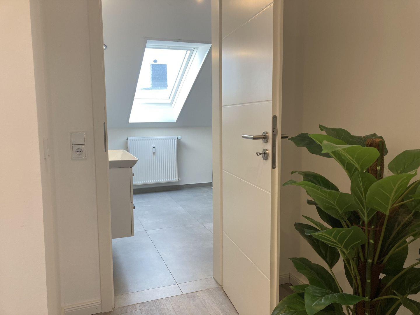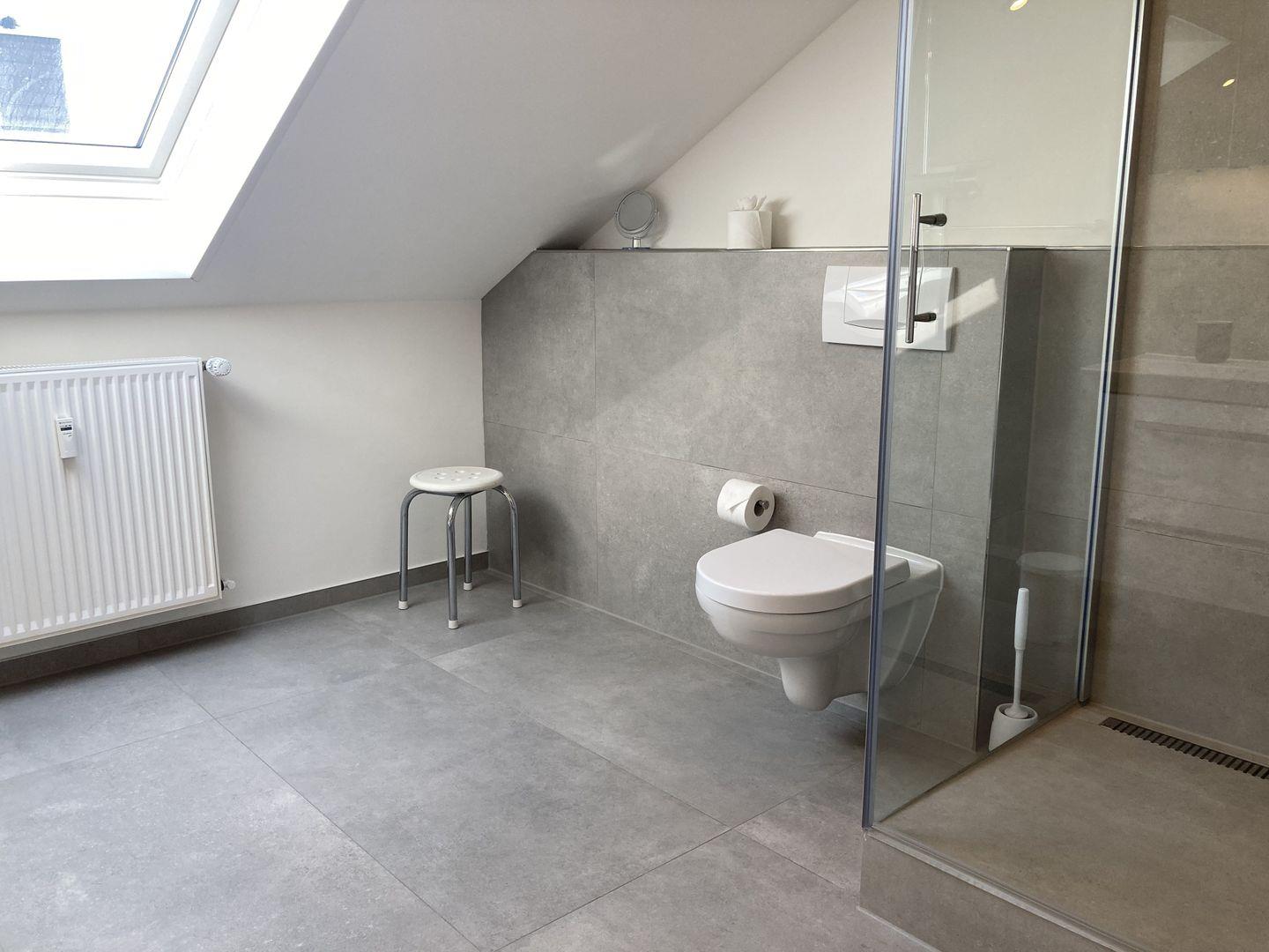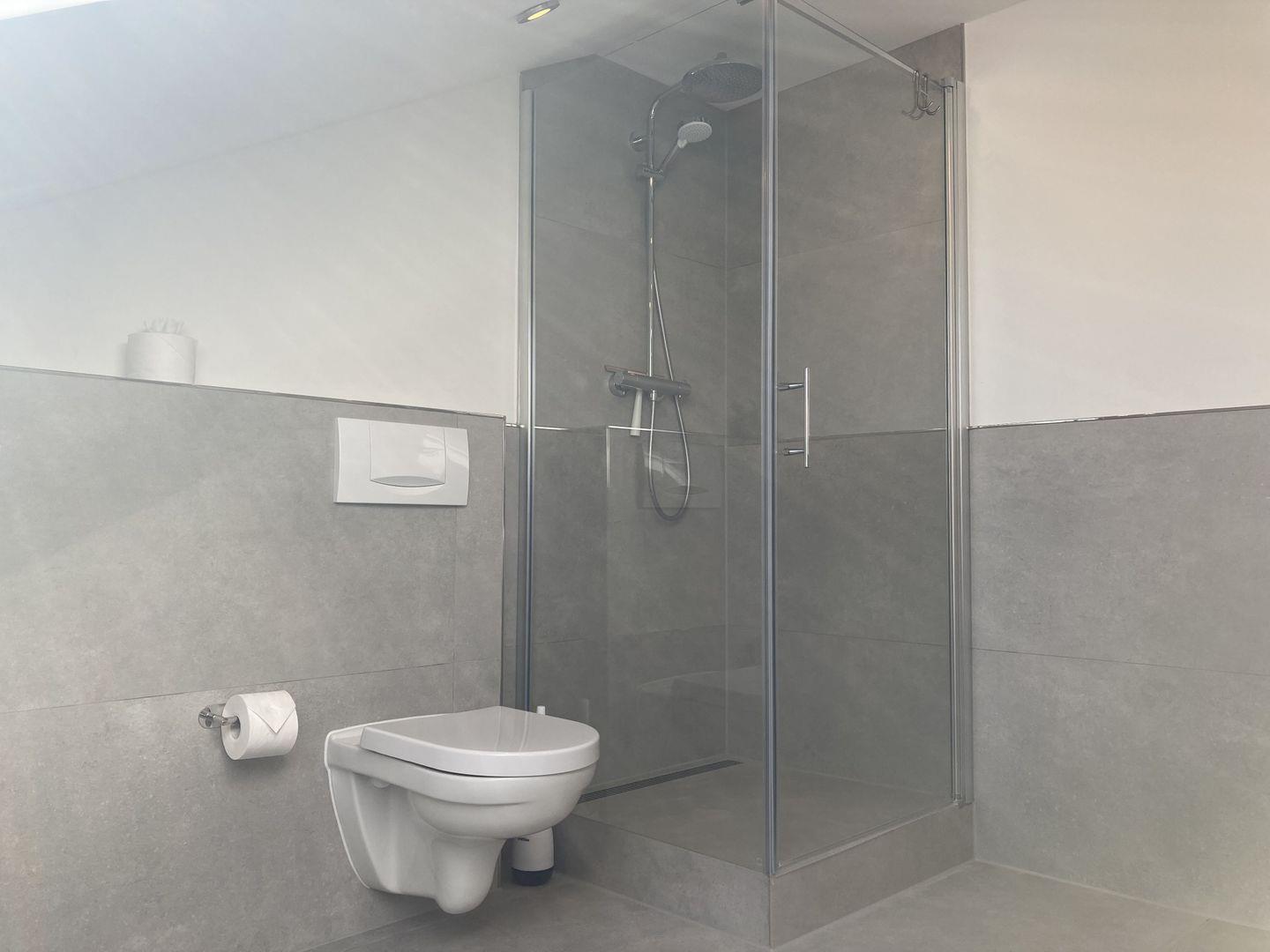 - tageslichthelles Badezimmer mit Dusche, WC und Föhn