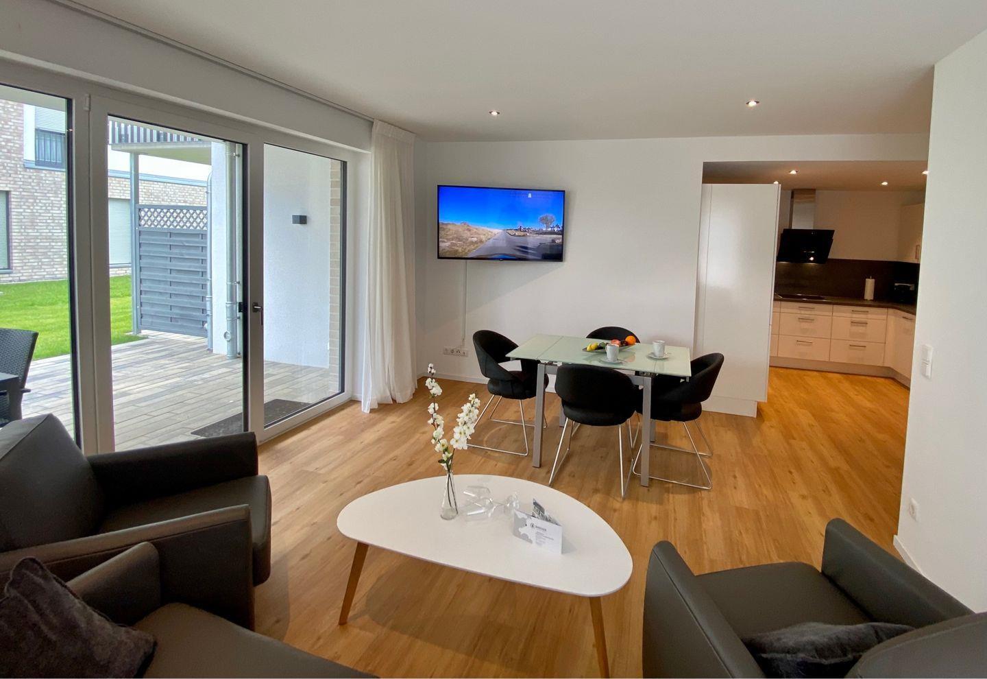 Willkommen in Ihrem neugebauten Urlaubsquartier! Das Apartment befindet sich im Erdgeschoss in Richtung Südosten und verfügt über ca.80 qm Wohnfläche. Es ist für eine Belegung mit bis zu vier Personen ausgestattet. Treten Sie ein! Im Eingangsbereich befindet sich eine Garderobe, der Eingang zum hochwertig gestalteten Duschbad für erholsame Momente trennt die Schlafräume voneinander. Der offene Wohn- und Essbereich besticht durch Helligkeit und klare Linien. Eine luxuriöse Wohnküche lädt zum entspannten Kochen ein. Über den Wohnbereich mit Couch, Sessel, Couchtisch, Sideboard und Fernseher erreichen Sie die Terrasse. Diese bietet auf der Südostseite Platz für Gartentisch und Stühle zum Entspannen und Essen. Im 1 .Schlafzimmer erwartet Sie ein komfortables Boxspring-Doppelbett (1,80 m Breite und 2,00 m Länge mit 2 Matratzen) sowie ein Schrank. Im 2. Schlafzimmer befindet sich ebenfalls ein Box-Springbett ( 2 Matratzen) mit Nachtschränken und Schrank. Ihr eigener Parkplatz sorgt für entspanntes Ankommen. Genießen Sie Ihren Urlaub in fantastischer Umgebung und schönem Sandstrand - keine 150 m von Ihrem Appartement entfernt. Ein lieber Hund ist ab sofort herzlich Willkommen!