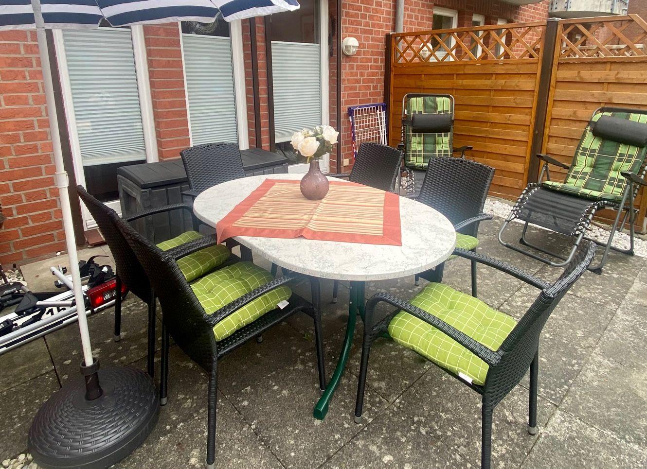 Das Apartment verfügt sowohl über einen kleinen Balkon als auch eine Terrasse. Auf den bereitgestellten Gartenmöbeln können Sie wunderbar die frische Ostseeluft genießen, entspannen oder Ihre Mahlzeiten im Freien einnehmen. Ein privater Parkplatz steht direkt an der Unterkunft zur Verfügung, sodass Sie Ihr Fahrzeug jederzeit sicher abstellen können.
