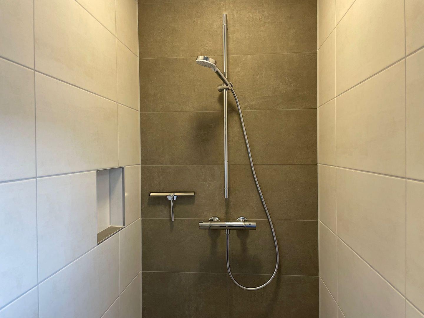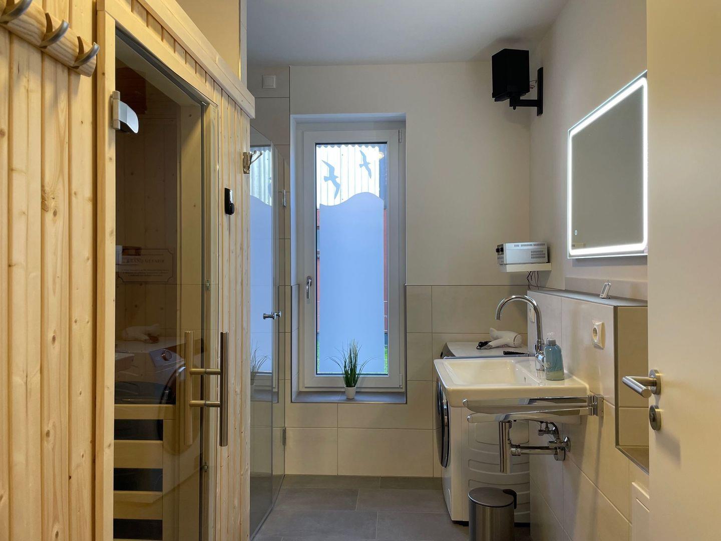 - ein geräumiges Bad mit Fenster, finnischer Sauna und bodentiefer Dusche mit Bonanza - Tür