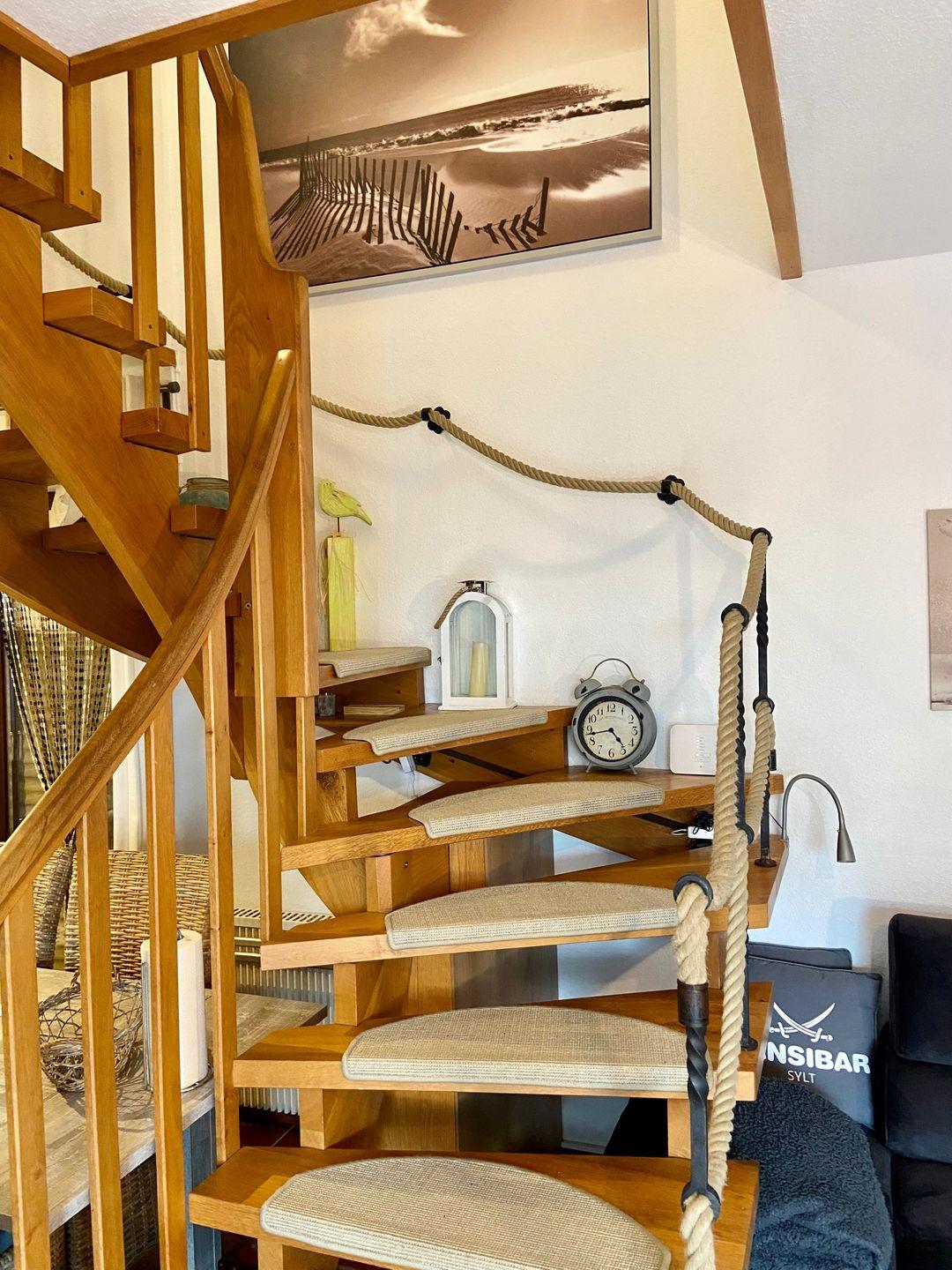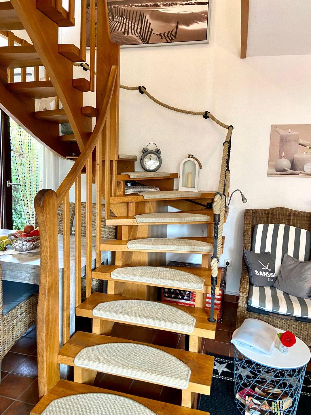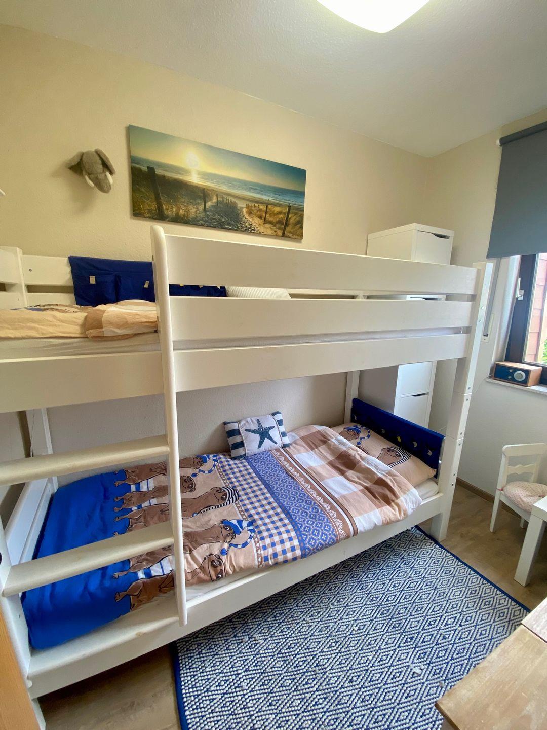 Im Obergeschoss befindet sich das Schlafzimmer mit Doppelbett (2 Matratzen á 90cm), das Kinderzimmer mit einem hochwertigen Etagenbett (2 Matratzen á 80cm) und ein Badezimmer mit Dusche und WC. Ein Hochstuhl und ein Kinderreisebett steht den kleinen Gästen zur Verfügung.