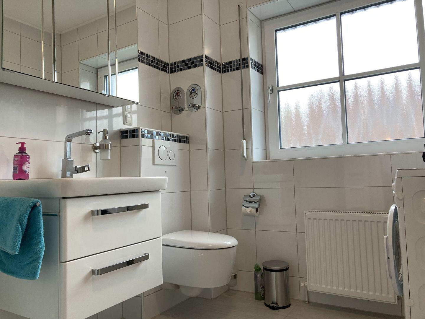 - Badezimmer mit Fenster, Dusche, WC, Föhn und Waschmaschine