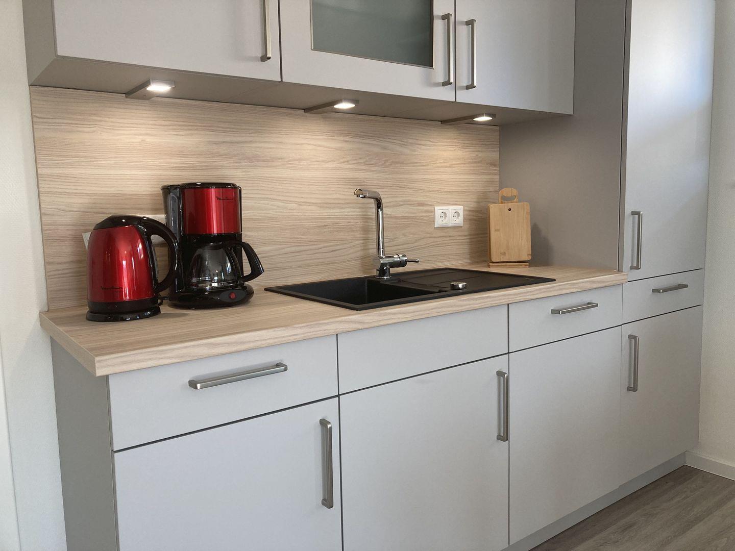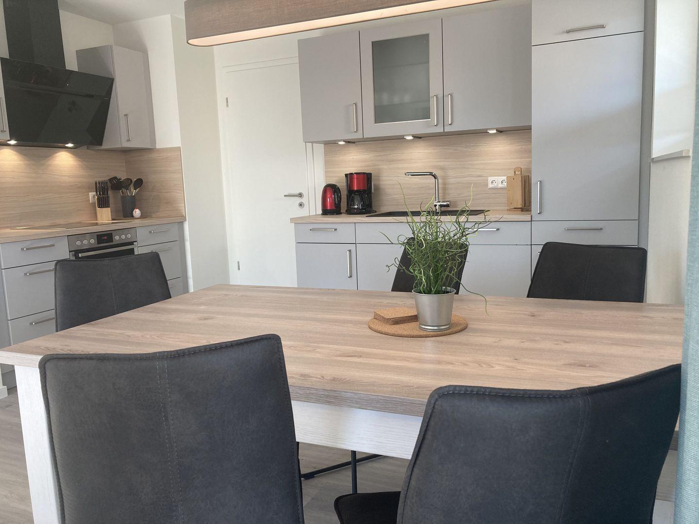 - im Wohnraum integrierte offene voll ausgestattete Küche mit Essplatz für 4 Personen