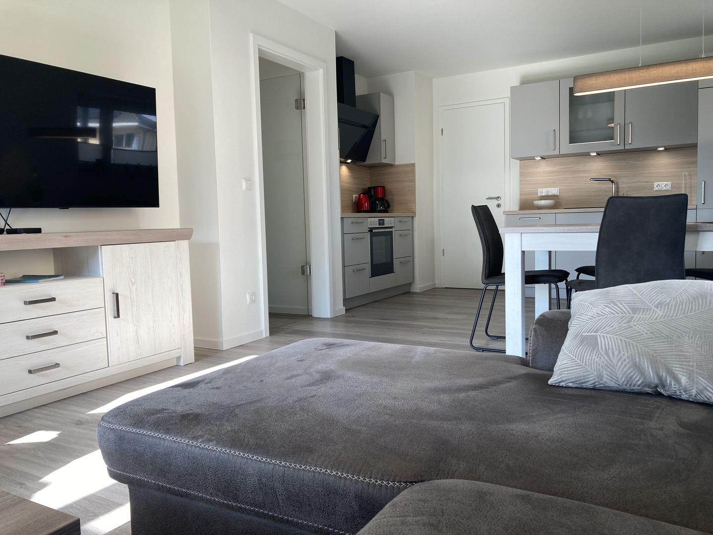 - modernes geschmackvoll eingerichtetes Wohnzimmer mit Sofa und Sessel, Flatscreen-Smart-TV im Wohnbereich, Musik über Radio/CD/Bluetooth