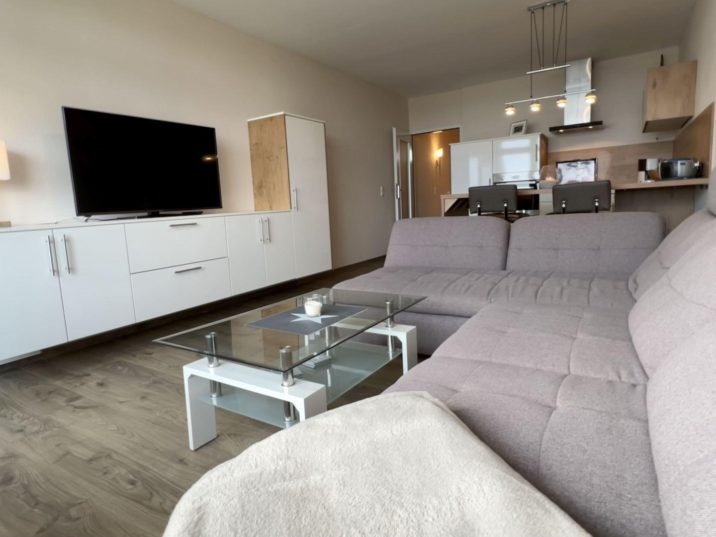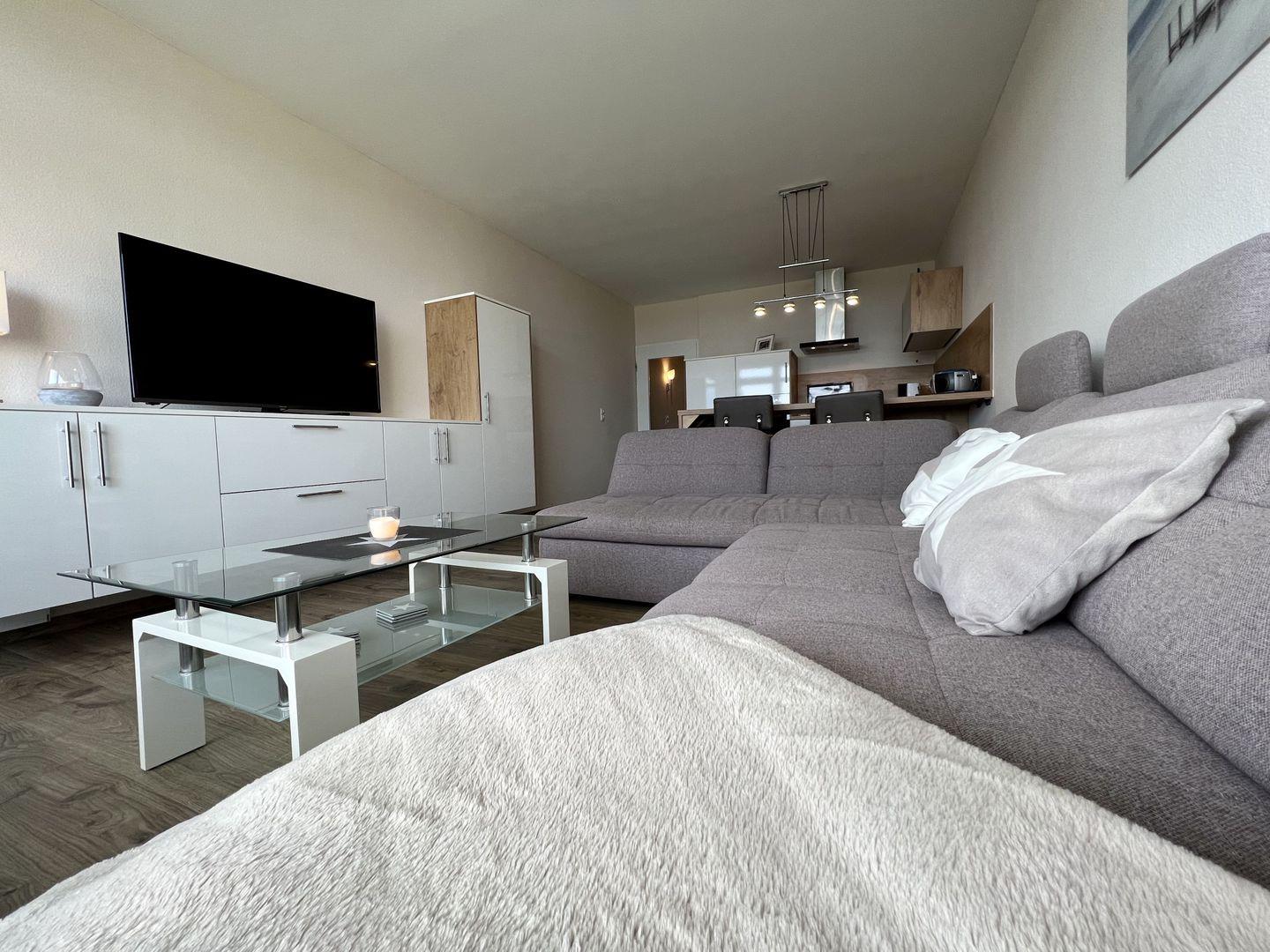 - Wohnzimmer mit gemütlichem Chaiselongue - Sofa und TV