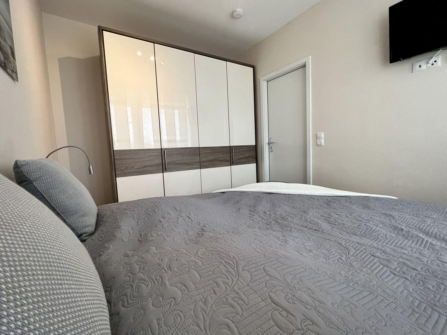 - Schlafzimmer mit Doppelbett, Kleiderschrank und Außenrolladen zum Verdunkeln