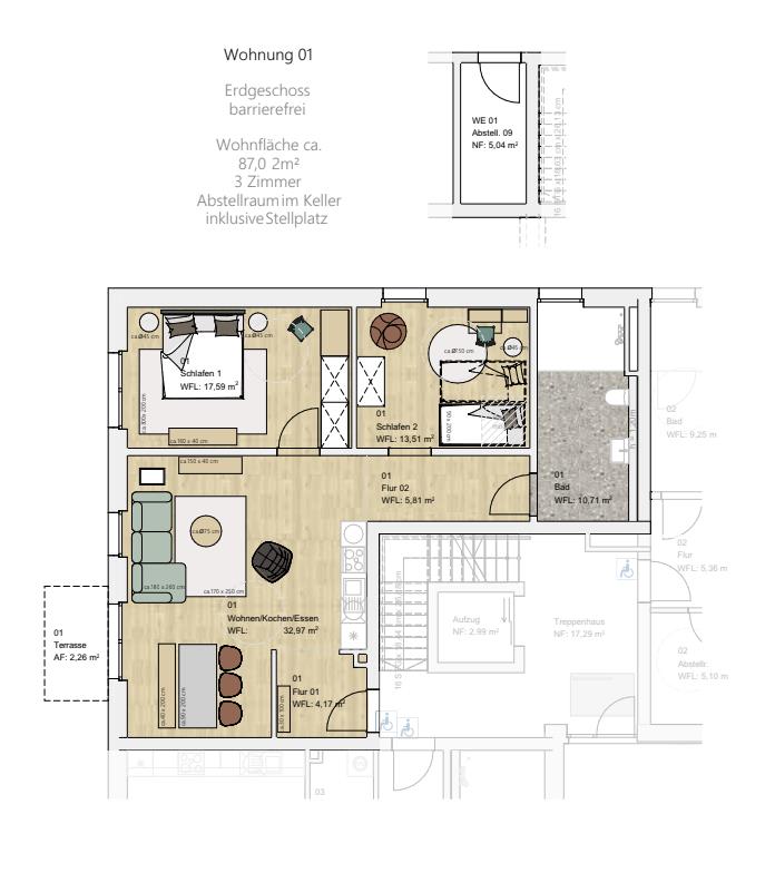 Die Wohnung verfügt über zwei Schlafzimmer. Das Hauptschlafzimmer ist mit einem komfortablen Boxspringbett für zwei Personen ausgestattet. Im zweiten Schlafzimmer befindet sich ein gemütliches Einzelbett. Beide Schlafzimmer bieten zudem ein eigenes TV-Gerät, einen geräumigen Kleiderschrank sowie einen integrierten Schreibtisch, der sich ideal zum Arbeiten oder für persönliche Tätigkeiten eignet.
