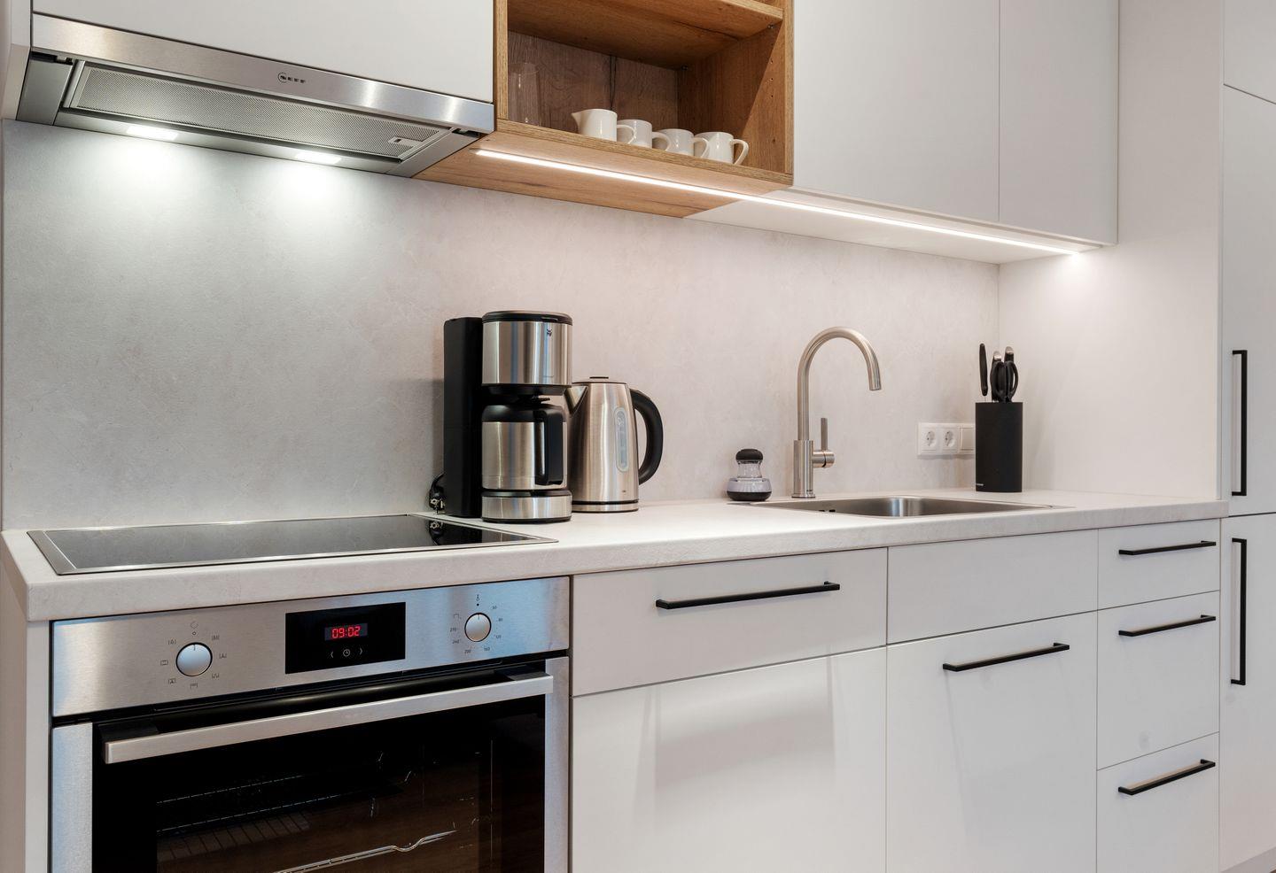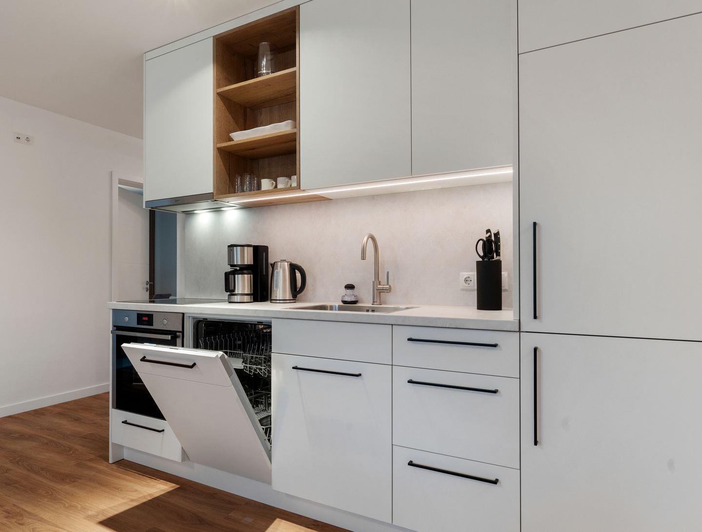 Hier erwartet Sie ein offener Wohnbereich, der durch seine helle und freundliche Gestaltung überzeugt. Die moderne Küchenzeile ist voll ausgestattet und bietet Ihnen alles, was Sie für die Zubereitung köstlicher Mahlzeiten benötigen. Im Wohnbereich lädt ein großzügiges Sofa zum Entspannen ein, während der Esstisch ausreichend Platz für gemeinsame Mahlzeiten bietet. Für Unterhaltung sorgt ein Fernseher, sodass es an nichts fehlt.