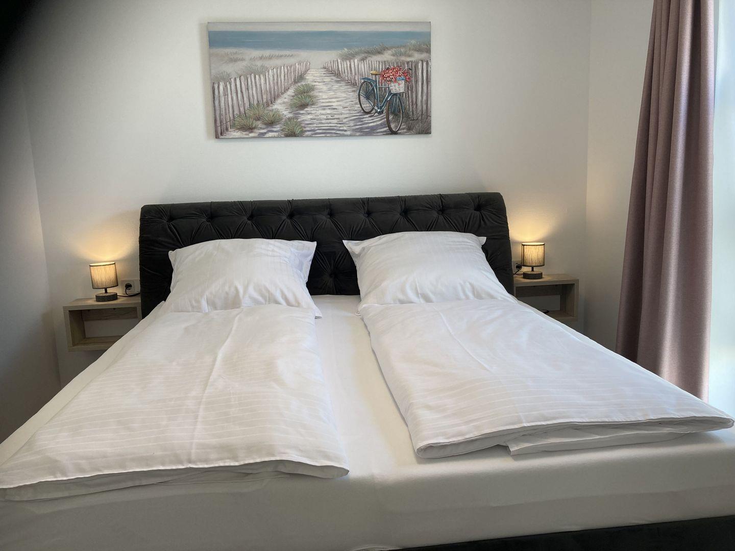- 2 Schlafzimmer mit je einem hochwertigen Doppelbett, Kleiderschrank und TV,