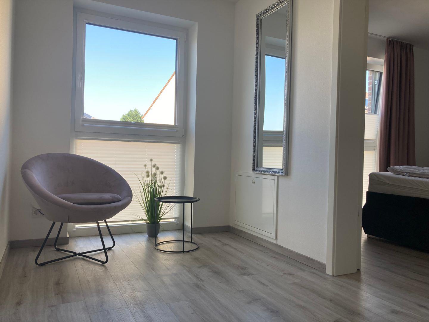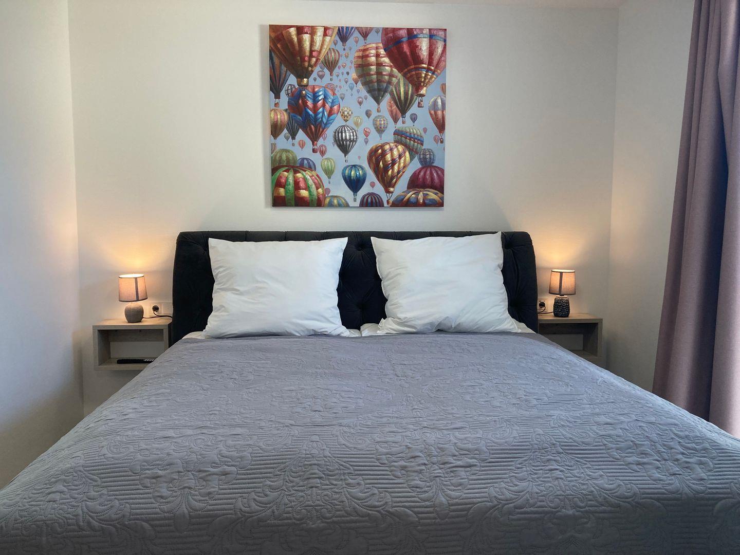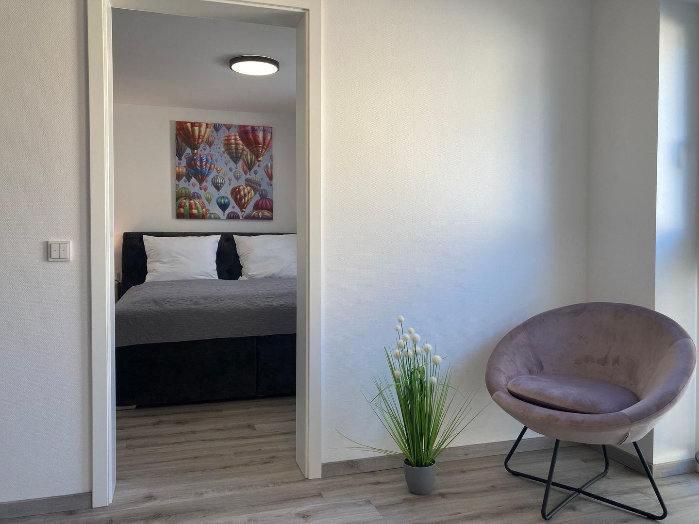 - Schlafzimmer mit hochwertigem Doppelbett, Kleiderschrank und TV,