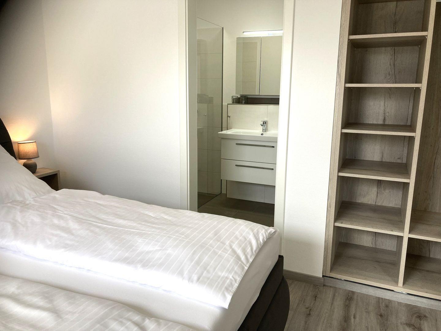 - Schlafzimmer mit hochwertigem Doppelbett, Kleiderschrank und TV,
