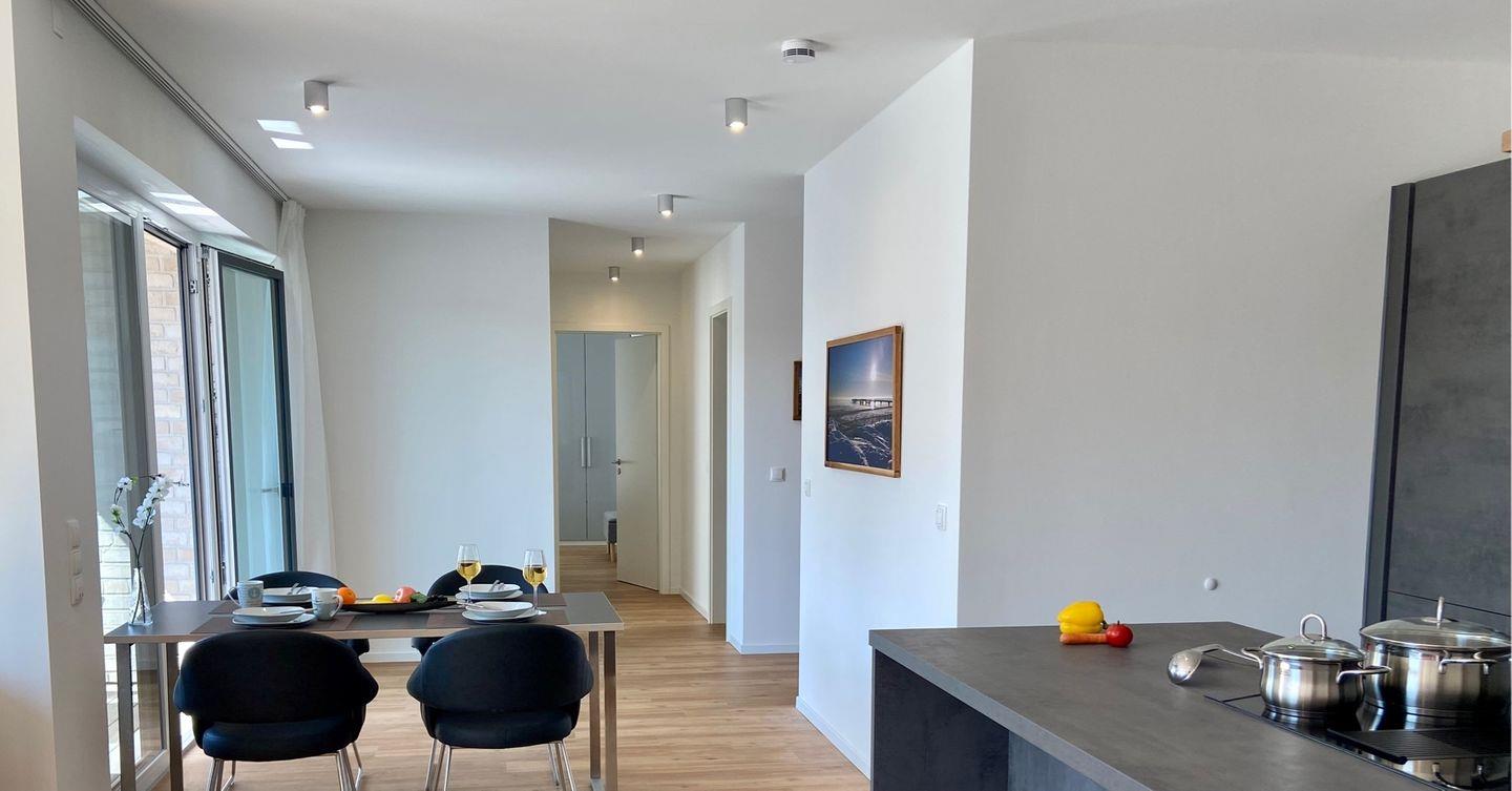 Die exklusive Ferienwohnung befindet sich im ersten Obergeschoss eines architektonisch sehr ansprechenden Neubaus, nur 250 Meter vom kilometerlangen Sandstrand und der Ostsee entfernt. Sie bietet einen exklusiven Rückzugsort kombiniert mit der besonderen Atmosphäre und dem Lifestyle von Dahme. Tolle Gastronomie am Meer, Beachbars, Shopping und zahlreiche Events erwarten Sie auf der lebendigen Promenade, die bequem in wenigen Minuten mit dem Fahrrad oder zu Fuß zu erreichen ist.