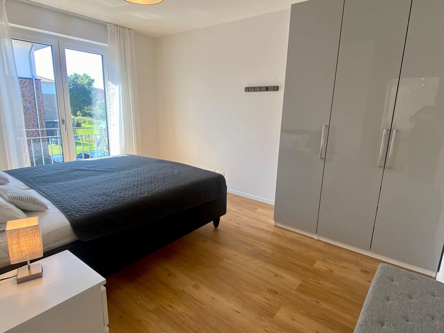 Es erwartet Sie eine äußerst hochwertig ausgestattete und geschmackvoll eingerichtete Ferienwohnung, die mit 2 separaten Schlafzimmern ausreichend Raum für 4 Personen bietet, um einen entspannten Urlaub in einem herrlichen Ambiente zu verleben. Fußbodenheizung, elektrische Außenjalousien und bodentiefe Fensterelemente, die für ein offenes Raumgefühl sorgen, gewährleisten einen hohen Wohnstandard. Mittelpunkt der Ferienwohnung bildet die Design Küche mit Kochinsel in bester Ausstattung, die zum gemeinsamen Kochen einlädt, Zusätzlich gibt es einen Essbereich . Der behagliche Wohnbereich, eingerichtet mit Sofa und TV, bietet Blick und Zugang auf die großzügig angelegte Südterrasse mit Garten- und Loungemöbeln, um den Tag bei einem Glas Wein ausklingen zu lassen. Beide Schlafzimmer bieten einen großzügigen Ausblick und sind mit Doppelbetten (2 x 90x200 cm) in unterschiedlichen Härtegraden (H2 und H3) ausgestattet. Beide Schlafräume verfügen über geräumige Schränke mit ausreichend Stauraum für die Urlaubsgarderobe. Das Bad ist sehr hochwertig und modern, ausgestattet mit einer Walk-In-Regendusche. Außerdem verfügt die Wohnung über ein Gäste-WC. Eine Waschmaschine befindet sich in einem Abstellraum in der Wohnung. WLAN steht selbstverständlich zur kostenlosen Nutzung zur Verfügung.