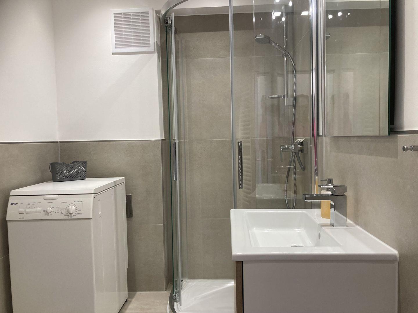 - Badezimmer mit Dusche, WC und Waschmaschine