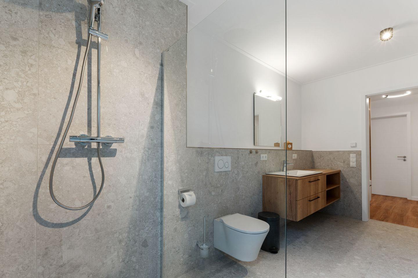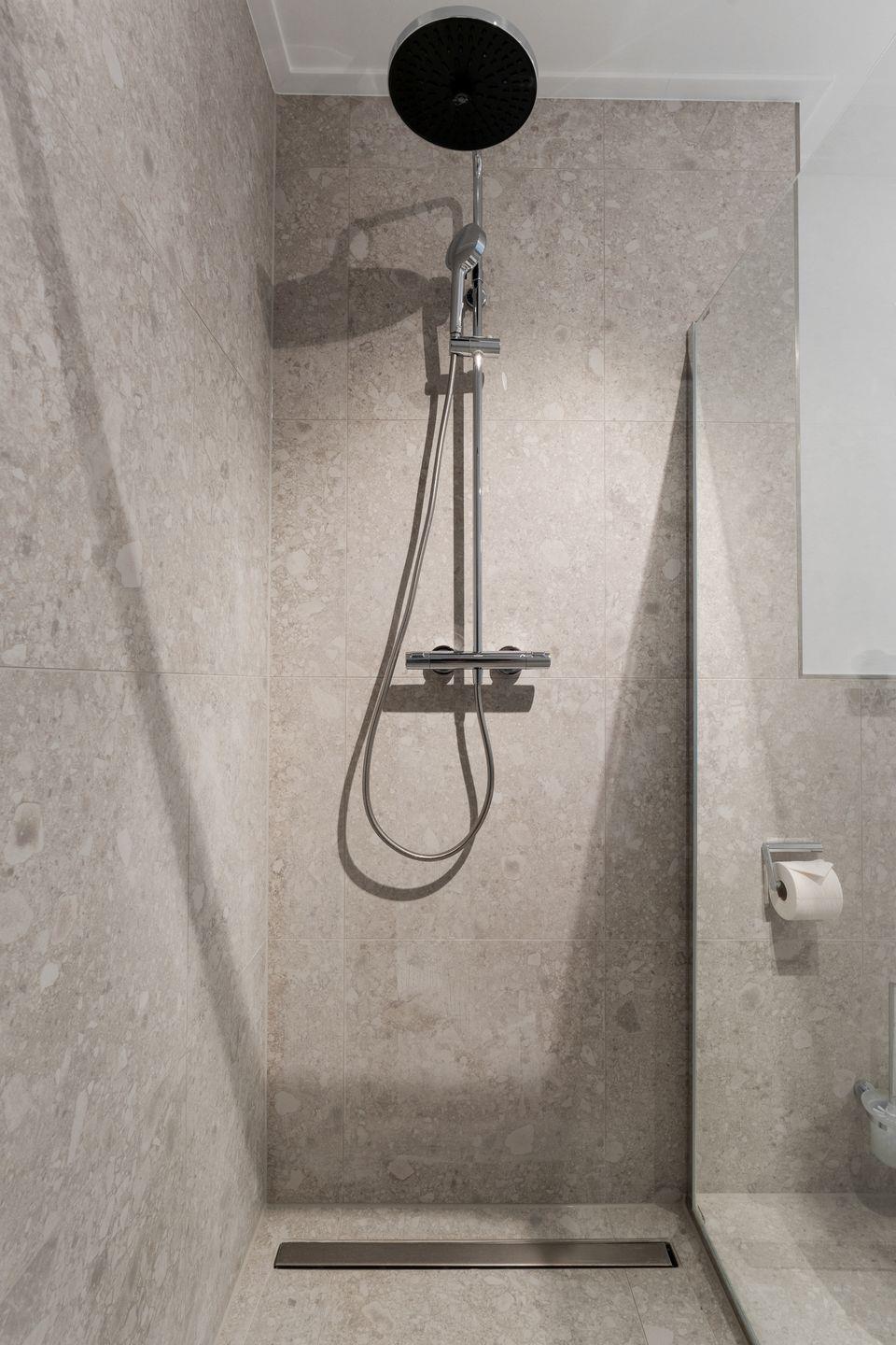 Das Badezimmer lässt Dank eines Tageslichtfensters viel natürliches Licht herein und ist mit einem stilvollen Waschtisch und einer modernen, ebenerdigen Dusche ausgestattet.