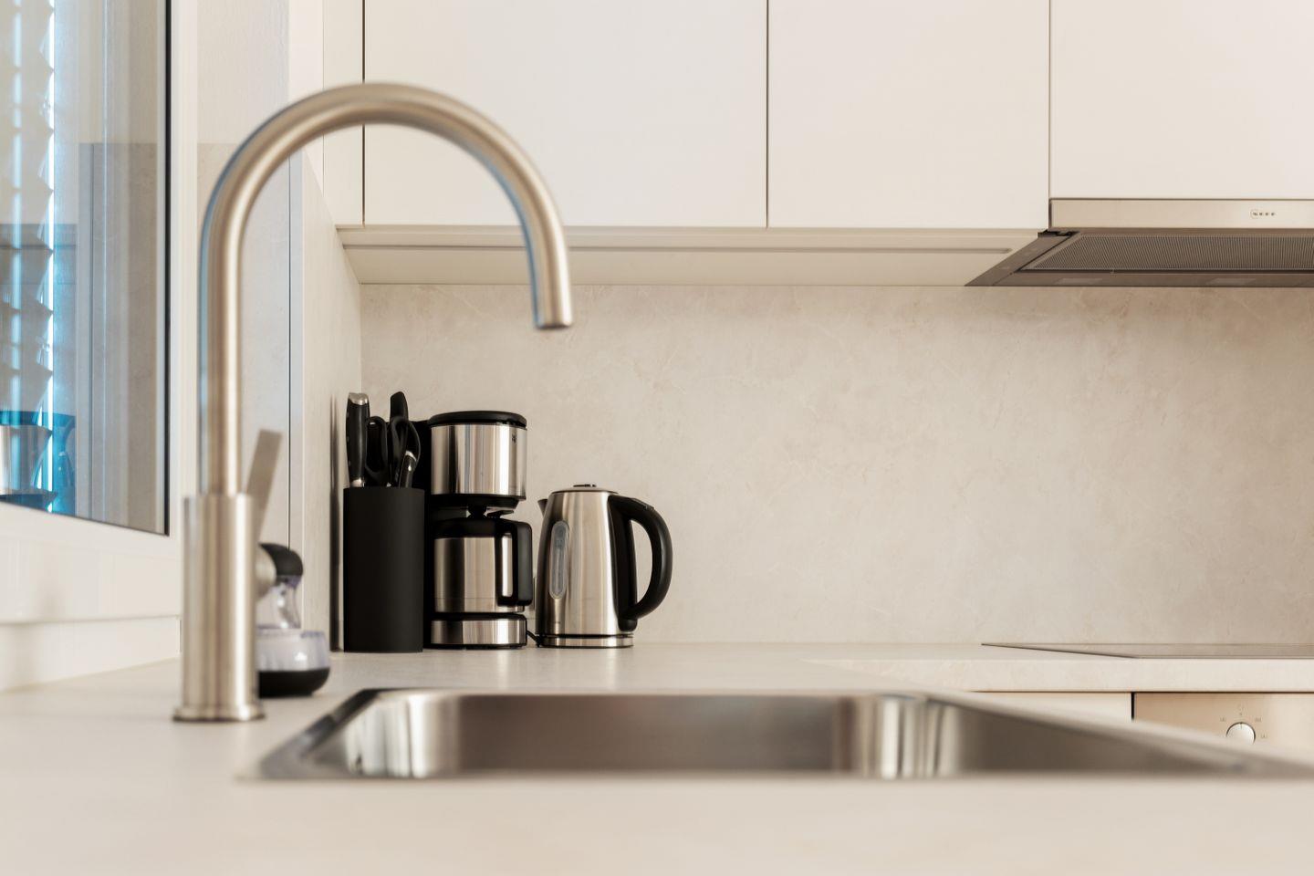 Hier erwartet Sie ein offener Wohnbereich, der durch seine helle und freundliche Gestaltung überzeugt. Die moderne Küchenzeile ist voll ausgestattet und bietet Ihnen alles, was Sie für die Zubereitung köstlicher Mahlzeiten benötigen. Im Wohnbereich lädt ein großzügiges Sofa zum Entspannen ein, während der Esstisch ausreichend Platz für gemeinsame Mahlzeiten bietet. Für Unterhaltung sorgt ein Fernseher, sodass es an nichts fehlt.