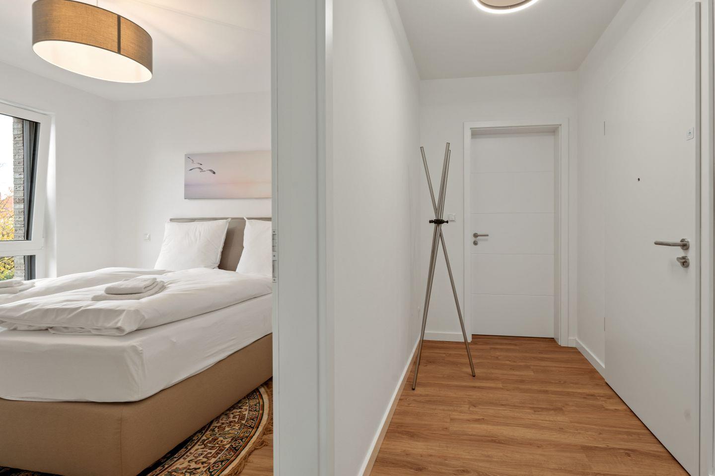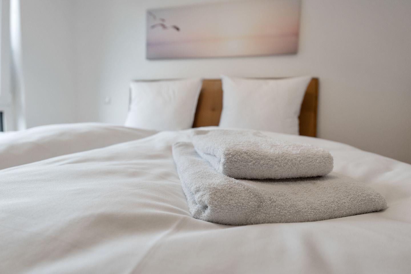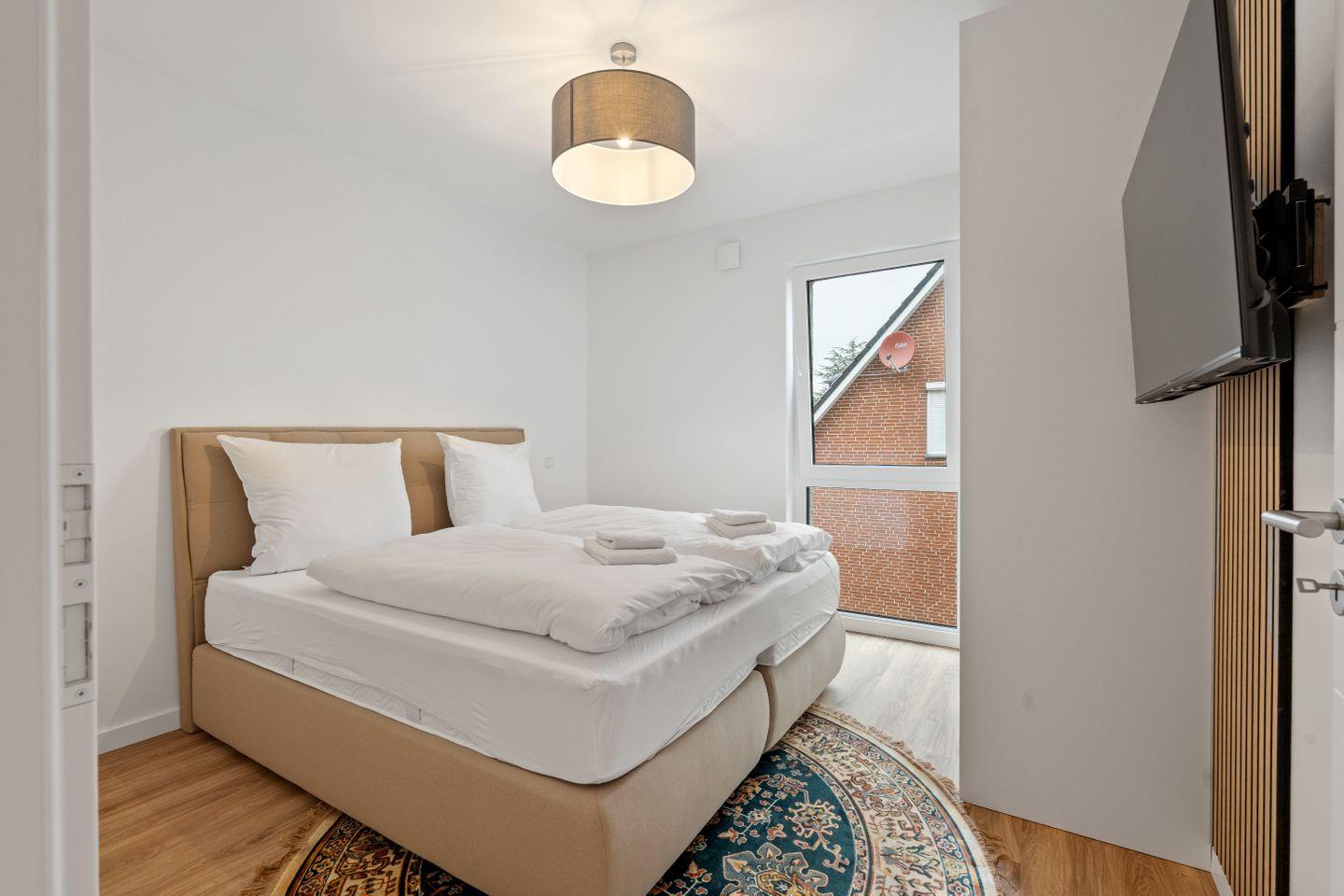 Die drei Schlafzimmer sind jeweils mit einem hochwertigen Boxspringbett für zwei Personen, einem weiteren TV-Gerät und einem geräumigen Kleiderschrank ausgestattet.