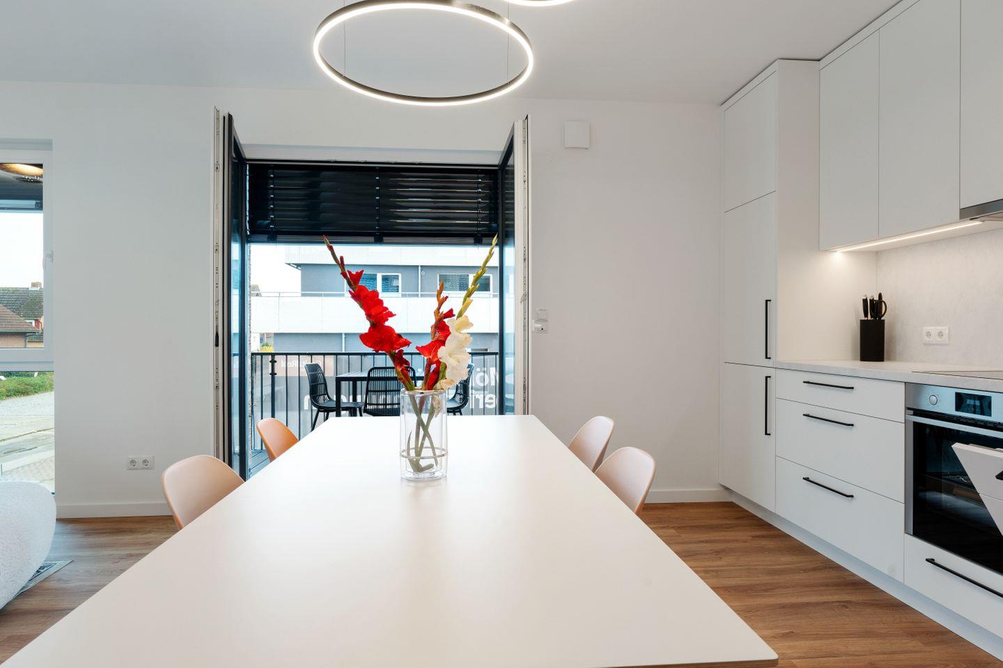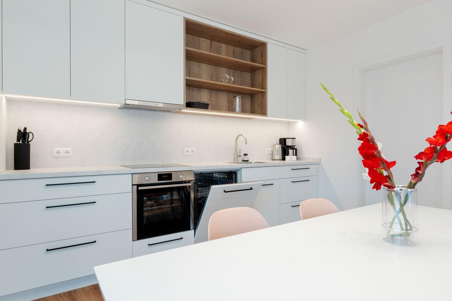 Der offene Wohn- und Essbereich mit voll ausgestatteter Küche lädt zum Kochen und Genießen ein. Eine gemütliche Sitzecke und eine bequeme Couch bieten Platz zum Entspannen, während der Balkon direkt vom Wohnbereich aus zugänglich ist und frische Meeresluft garantiert.