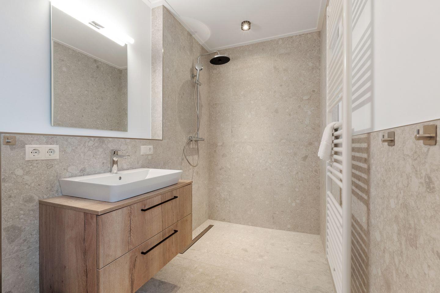 Das elegante Bad ist mit einer bodenebenen Dusche ausgestattet und bietet somit zusätzlichen Komfort.