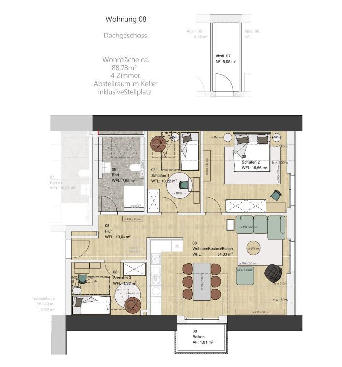 Für ruhige Nächte und optimalen Komfort stehen drei geschmackvoll eingerichtete Schlafzimmer zur Verfügung: Das Hauptschlafzimmer besticht mit einem großzügigen Doppelbett und einem eleganten Ambiente. Die beiden weiteren Schlafzimmer sind mit Einzelbetten ausgestattet und bieten jeweils eine ruhige Rückzugsmöglichkeit.