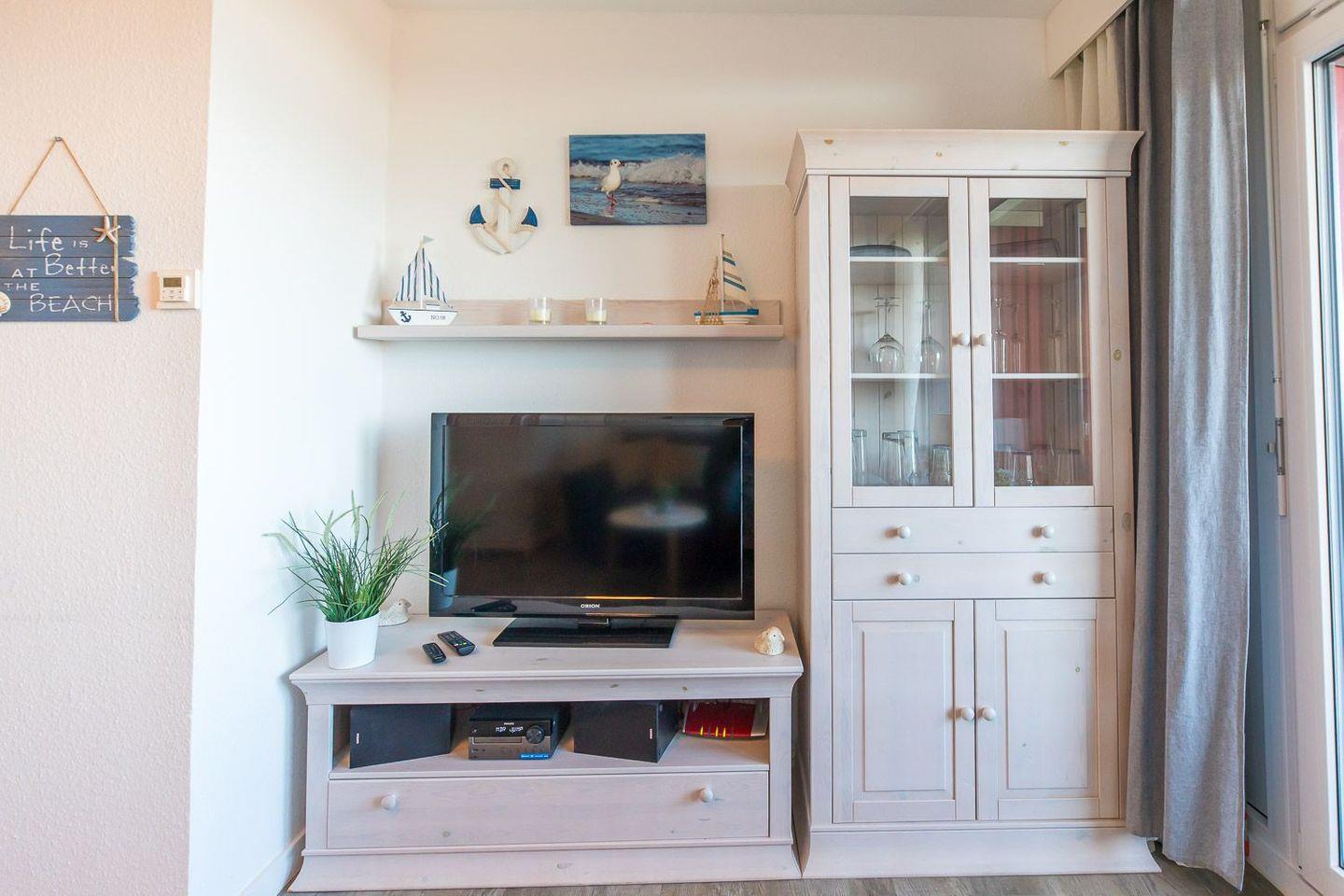 - Wohn-, Schlafzimmer mit Chaiselongue-Sofa, TV und direktem Zugang zum möbliertem Balkon,
