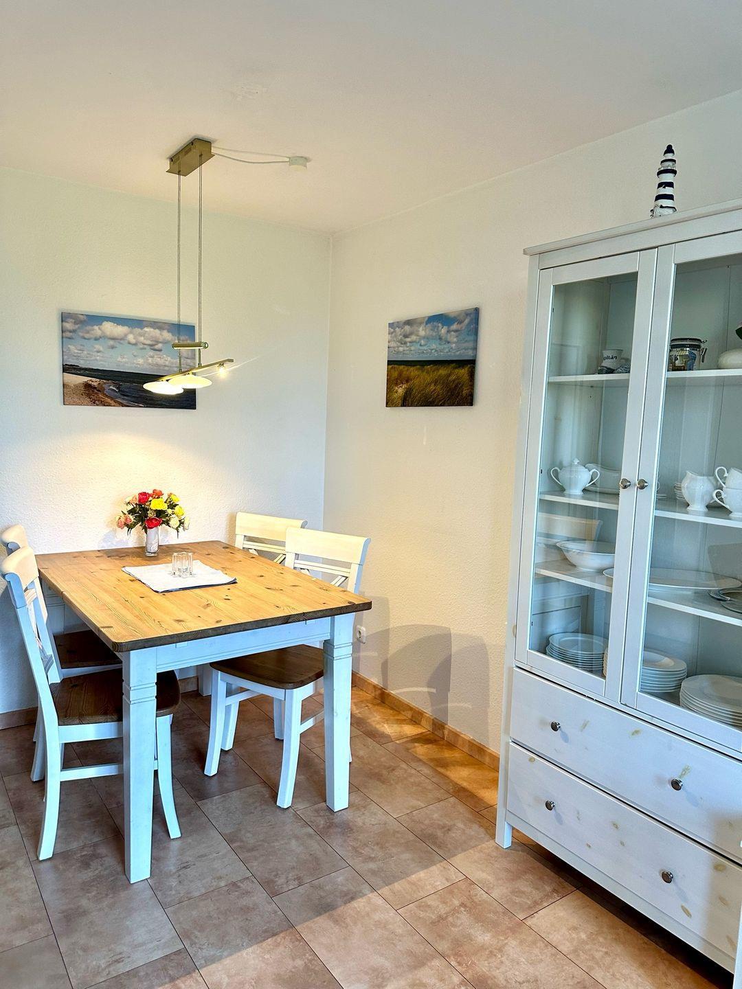 Hereinspaziert - Ihr Zuhause auf Zeit begrüßt Sie mit einem gemütlichen Wohnzimmer mit Ess- und TV-Ecke. Wenn die Sonne lacht, lockt zudem die möblierte Terrasse und der kleine Garten zur ruhigen Westseite. Wie wäre es hier mit einem Begrüßungsdrink? In der gut ausgestatteten Küche können Sie sich prima selbst verpflegen. Eine Spülmaschine hilft Ihnen beim Abwasch. In der oberen Etage erwarten Sie zwei separate Schlafzimmer, eins mit einem Doppelbett (2 x 90x200 cm) und eins mit 2 Einzelbetten (2 x 90x200 cm) und TV. Sicher werden Sie hier von der Ostsee träumen, die sich nur rund 150 Meter entfernt befindet. Munter starten Sie in den neuen Urlaubstag im hell gefliesten Duschbad. Im Erdgeschoss gibt es zudem ein Gäste-WC mit Waschmaschine. Ein Babybett sowie ein Kinderhochstuhl sind ebenfalls im Haus vorhanden.